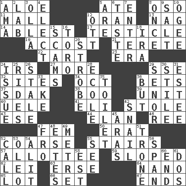 ACROSS 1. _ vera 5. Had dinner 8. Bear (Spanish) 11. Promenade 12. NW Algerian seaport 13. Tired old horse 14. Most capable 17. A testis 19. Buttonhole 21. Cigar-shaped 22. Small pie 23. Period 24. Big collection agency 27. Greater amount 29. Compass dir. 32. Settings 34. Sep. follower 36. Stakes 37. Neighbor of Neb. 38. Surprise greeting 39. A single undivided whole 40. Ubangi River tributary 41. Biblical high priest 42. Fur scarf 43. Compass dir. 44. Flair 46. To separate or throw off 47. Opposite of masc. 50. Part of Q.E.F. 52. Rough 55. Flight of steps 57. One to whom something is allotted 59. Inclined 62. Flowery wreath 63. Celtic language 64. Billionth: prefix 65. Car dealer's back yard 66. Arrange properly for use 67. Conclusions DOWN 1. Nursemaid (var.) 2. Experiment locale 3. Spanish pot 4. Opt 5. "We ___ not amused" (Victoria) 6. Clothes sense 7. Keyboard key 8. At one time in the past 9. Table seasoning 10. Double curve, resembling the letter S 12. Baseball player Mel 15. Fraudulent business schemes 16. "Corrida" creature 18. Retirement account (abbr.) 20. Disco prop 24. Come out of 25. Amusement-park features 26. Lacking originality or spontaneity 28. Learning spot: Fr. 29. Sir (Sp.) 30. Vertical member of a panel or frame 31. First name in cosmetics 33. Make supply last 35. Rest room 36. Yet 42. Slow-paced one 45. Caspian sea tributary 47. Away 48. _____ Park, CO 49. Distance measurement (Brit.) 51. Marketplace scale 52. Give a ring to 53. Margarine 54. Came down and settled, as after flight 55. Observe 56. Connect, as a bridge 58. Eastern Standard Time (abbr.) 60. Conclude 61. Two (Sp.)