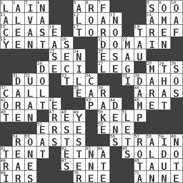 ACROSS 1. (Had) reclined 5. Sandy's bark 8. "Barney Miller" actor Jack 11. Inventor's middle name 12. Grant temporary use of 14. Housemaid (var.) 15. Stop 17. "Corrida" creature 18. Unclean, religiously 19. Gossips 21. Realm 23. Elected rep. 25. He sold his birthright 26. Tenth: prefix 27. Part of a journey 28. Mountains (abbr.) 31. Superhero pair 33. Affectionate concern, for short 35. Potato state 37. Give a ring to 38. Ewer handle 40. Caspian sea tributary 41. Speak pompously 43. Writing tablet 45. Was introduced to 46. "___ Little Indians" 47. Marina Del _, California 50. Seaweed 52. Celtic language 53. Compass dir. 54. Ridicules or criticizes harshly 56. Put through a sieve 61. Portable shelter 62. Inactive volcano in Sicily 65. Twentieth part of a lira 66. Actress Charlotte 67. Posted 68. Strained 69. Big collection agency 70. To riddle 71. Singer Murray DOWN 1. Made of lace 2. Toward shelter 3. "Terrible" tsar 4. Political cartoonist Thomas 5. The first octave above the treble staff 6. Friend of Pooh 7. Bundle 8. Indian skirt 9. Sign of things to come 10. Clumsy lout 13. Trap for birds or small mammals 16. Comfort 18. The 19th letter of the Greek alphabet 20. Religious group 22. Wise men 24. "Death on the ____" 26. Stupid person 28. Female horse 29. Not this but _ 30. Mayday 31. Have the gumption 32. ____ Bator 34. Head covering 36. Moist 37. Small bed 39. Libertine 42. Blunders 44. Habitations of wild animals 48. _____ Park, CO 49. Of or pertaining to yesterday 51. Allows 52. Consume 54. Posterior 55. Singles 57. Roll call or roster of names 58. ____ Jay Lerner 59. Goddess of spring and wife of Bragi 60. Observe 61. Three (prefix) 63. Compass dir. 64. Had dinner