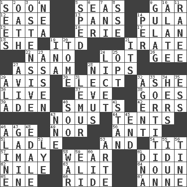 ACROSS 1. Within a short period 5. Oceans 9. Slender fish 12. Comfort 13. Zero-star reviews 14. Monetary unit of Botswana 15. Singer James 16. 4th largest of the Great Lakes 17. Enthusiasm 18. A female animal or person 19. It would 21. Feeling or showing extreme anger 22. Billionth: prefix 24. Car dealer's back yard 26. Unit of force equal to gravity 27. Indian state 28. Pinches, bites 29. Deliberation 30. Choose 32. American tennis player Robert 36. Moving, as bait 37. First lady 38. Leaves 39. Arabian gulf 40. Obscenities 42. Blunders 43. Horse sense 44. Portable shelters 46. Mature 49. Not either 50. Against 51. Dipping utensil 53. Plus 54. Teat (slang) 57. "If ____ say so..." 58. Put on (as clothing) 61. "You Light Up My Life" star Conn 62. The longest river in the world 63. Came down and settled, as after flight 64. Part of speech 65. Compass dir. 66. Travel on or in a vehicle 67. Queen of England 1702-14 DOWN 1. Perceives with the eye 2. Pledge 3. Clearly or manifestly demonstrative 4. Teachers' org. 5. Broke a traffic law 6. Ewer handle 7. Cuckoo 8. Compass dir. 9. Russian prison camp 10. Having winglike extensions 11. Indian princess (variant) 14. For each 19. _ tizzy (2 wds.) 20. Heavy book 21. It is 23. NE Netherlands city 24. It is permitted: Lat. 25. Choose 27. Enthusiastic 28. Mole, birthmark 29. Wing 31. Arboreal primate 32. Rep 33. Determination 34. Possessive pronoun 35. Double-curved letter 40. "Barney Miller" actor Jack 41. Comedian Laurel of Laurel & Hardy 43. Compass dir. 45. Conclude 46. Place in a line 47. Homeless child 48. Peak District village in England 52. Sodium hydroxide 53. Johnson of "Laugh-In" 55. Goddess of spring and wife of Bragi 56. Prong on a fork 58. Armed conflict 59. Biblical high priest 60. Help 61. Heredity factor (abbr.)