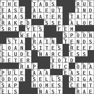 ACROSS 1. Definite Article 4. Bar bills 8. Sorrow 11. Relaxation 13. Native American of Southwest Alaska 15. Working for oneself (abbr.) 16. Caspian sea tributary 17. Mother 18. Jacques of French films 19. Moved through 21. Compass dir. 22. Medicinal plant 23. Indian title of respect (Mr.) 24. Consenting reply 27. Opposite of masc. 29. Welt 30. Soup utensil 34. R.R. building 36. Water falling in drops from the sky 39. Watches over 40. Grant temporary use of 41. Locates 43. Coral ridge 44. Evade 46. Drug cop 47. Double-curved letter 48. Prevent from occurring 49. Null 51. Strike 53. And so on (abbr.) 54. Mouth or opening 57. Whimper 60. Auto club (abbr.) 63. Artist's stand 65. Scent 66. Exchanges for money 69. Port city in Latvia 70. Plant excrement 71. Dwellings 72. Penny 73. Raised railways 74. Political cartoonist Thomas 75. Actress Charlotte DOWN 1. Lacerates 2. Ethiopian city, capital of Harari 3. 1973 Nobel Price Winner (Physics) Leo 4. Scottish cap 5. Wing 6. Wagers 7. Takes to court 8. Monetary unit of Yemen 9. To (old English) 10. Singer Brickell 12. Compass dir. 14. Not kosher 18. ________ with (broke a safety seal) 20. Color 25. Hearing organs 26. Killed 28. Eastern Standard Time (abbr.) 29. Roamer 31. Singles 32. Lyric poems 33. Science/research agcy. 34. Flatfish 35. Strained 37. Call ___ day 38. Impudent aggressiveness 40. Directed 42. Native of Scotland 45. Period 50. Frozen water 52. Romantic infatuation 54. Flexible twig of a willow tree 55. Rain (Swedish) 56. Having winglike extensions 57. Airs 58. Hereditary estate 59. Chops off 61. Age 62. _ mater 64. Curve 67. French article 68. Fast jet (abbr.)