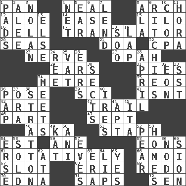 ACROSS 1. Baking dish 4. Actress Patricia 8. Bowlike part 12. Medicinal plant 14. Relaxation 15. _ and Stitch 16. Small valley 17. Interpreter 20. Oceans 21. ___ good deed 22. Numbers guy (abbr.) 23. Effrontery 27. Brightly colored fish 29. Hearing organs 31. Sliced desserts 34. Distance measurement (Brit.) 35. Vintage cars 36. Introduce or present, as a question 39. _-fi 41. Is not 42. Johnson of "Laugh-In" 43. Hang back 46. Role in a play 47. Back-to-school mo. 48. "____ silly question..." 51. Staphylococcus 54. Eastern Standard Time (abbr.) 56. One (Scot) 58. Immeasurably long periods of time 61. Rotating or pertaining to rotation 66. Mine, in Marseilles 67. Groove 68. One of the Great Lakes 69. Make new 70. Pulitzer Prize-winning author Ferber 71. Plant excrements 72. Elected rep. DOWN 1. Groovy apts. 2. Toward shelter 3. Pitcher Ryan 4. Fish or hair follower 5. Ewer handle 6. White ___ sheet 7. Grant temporary use of 8. In the manner of 9. Actors Guy, Robert Welles, and Clint 10. Hoof sound 11. Israeli folk dance 13. Otherwise 18. "Barney Miller" actor Jack 19. Infant locale 24. Portuguese money of account (variant) 25. Large container 26. Blunders 28. Showery time 30. Religious groups 32. A really long time 33. Fast jet (abbr.) 34. Confronts 36. Infant food 37. Mouth or opening 38. Ski resort town in Vermont 40. Angers 44. Fitting 45. Call ___ day 49. Krazy ___ of comics 50. Cuckoo 52. Lightbulb-shaped fruit 53. Residences 54. Celtic language 55. Disposed of to a purchaser 57. Nights before holidays 59. Thickened enlargement 60. The Jewish people; Israel 62. _ moment's notice (2 wds.) 63. Period 64. Mouth edge 65. Consenting reply