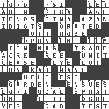 ACROSS 1. "Corrida" creature 5. 23rd letter of the Greek alphabet 8. Allow 11. Arabian gulf 12. Capital of Latvia 14. Personal question 15. Watches over 17. Inactive volcano in Sicily 18. Muslim summons to prayer 19. Foolish or stupid persons 21. Spoke pompously 23. Baseball player Mel 25. Loose flowing garment 26. Musical composition 27. Compass dir. 28. Opposite of masc. 31. Electrically charged atom 33. Tired old horse 35. Swap 37. 1/640 square mile 38. To riddle 40. A single undivided whole 41. Desist 43. Sodium hydroxide 45. Car dealer's back yard 46. Begley and Asner 47. Krazy ___ of comics 50. Raze (variant) 52. Ubangi River tributary 53. Compass dir. 54. Place where plants grow 56. Follows as a consequence or result 61. Australian parrot (variant) 62. Hereditary estate 65. Small fatty European fish 66. Single 67. False hair 68. Legendary monster 69. It is so 70. June honoree 71. Trial DOWN 1. Jacques of French films 2. Wrote a lyric poem 3. Painter Guido (1575-1642) 4. Southwest Nigerian state 5. Before (prefix) 6. Be seated 7. Dismiss 8. Goldbrick 9. Mild oath 10. "___ Little Indians" 13. Composer Copland 16. Cease 18. Had dinner 20. Surprise greatly 22. Collude with 24. Russian ruler of old 26. Singles 28. Papal veil 29. Prepare for publication 30. Was introduced to 31. On the rocks 32. Mouths or openings 34. Set 36. General guideline 37. Adept person 39. Jane of fiction 42. Supplemented with great effort 44. Comfort 48. Native American of Southwest Alaska 49. Watched over 51. Elected reps. 52. RI univ. 54. Went 55. Ancient Greek god of war 57. Specific locale 58. Goad 59. Hearing organs 60. Proofreading order 61. Myrna of the movies 63. "One Day ___ Time" 64. Directed