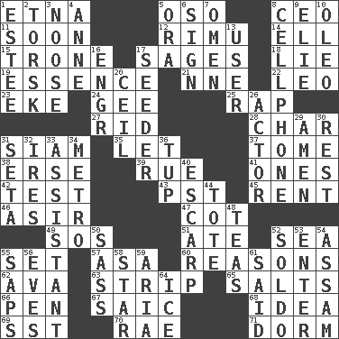 ACROSS 1. Inactive volcano in Sicily 5. Bear (Spanish) 8. Corporate head (abbr.) 11. Within a short period 12. Tall New Zealand timber tree 14. Pipe bend 15. Marketplace scale 17. Gurus 18. Untruth 19. Center 21. Compass dir. 22. Lion 23. Supplement with great effort 24. Turn to the right 25. Reproach for some lapse or misdeed 27. To free from 28. Burn to charcoal 31. Thailand, formerly 35. Allow 37. Heavy book 38. Celtic language 39. Regret 41. Singles 42. Trial 43. Pacific Standard Time (abbr.) 45. Monthly bill 46. SW Saudi Arabia district 47. Small bed 49. Mayday 51. Had dinner 52. Ocean 55. Put into a specified state 57. White ___ sheet 60. Thinks logically 62. Actress Gardner 63. Long narrow piece of something 65. Table seasonings 66. Animal enclosure 67. Ketch in the Levant 68. The content of cognition 69. Fast jet (abbr.) 70. Actress Charlotte 71. Dormintory (informal) DOWN 1. First name in cosmetics 2. Cod relative 3. Trap for birds or small mammals 4. Queen of England 1702-14 5. Mouth or opening 6. Public display of a written message 7. Sign of things to come 8. Portable communications device 9. Writer Wiesel 10. Butter sub 13. One who makes use of a thing 16. Engineer (abbr.) 17. Sowing specialist 20. To provide with a ceiling 26. Thespian 29. So be it 30. Repose 31. Bristle 32. Angers 33. Aide 34. Paris' subway 36. Uncastrated adult male sheep 40. Fortification 44. Carry 48. Afternoon social gatherings 50. Backtalk 52. Twentieth part of a lira 53. Keyboard key 54. Indian state 55. Plant excrements 56. Nights before holidays 58. Play the lead 59. Roberta Peters solo 61. Stated 64. Frozen water