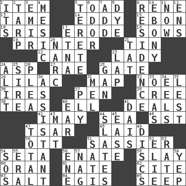 ACROSS 1. Detail 5. Frog relative 9. French philosopher Descartes 13. Not wild 14. Whirlpool 15. Inky black, to poets 16. Indian titles of respect 17. Eat (away) 18. Sty mamas 19. Hard copy producer 21. Shallow baking pan 22. Patter 23. Kenny Rogers chart-topper in '80 24. Cleo's killer 27. Actress Charlotte 28. Yard entry 29. Pale purple color 31. Atlas unit 32. Christmas carol 36. Angers 37. Animal enclosure 38. Algonquian 39. Beverages made from leaves 40. Pipe bend 41. Allots cards 42. "If ____ say so..." 44. Ocean 46. Fast jet (abbr.) 47. Russian ruler of old 48. Put down 50. Baseball player Mel 51. More lively and spirited 54. Bristle 56. Maternal 58. Kill 60. NW Algerian seaport 61. Nathan's nickname 62. Quote 63. Table seasoning 64. Armor plate that protects the chest 65. Ooze DOWN 1. ___ a Wonderful Life 2. Canvas cover 3. Independent ruler or chieftain 4. Mesonic 5. Cigar-shaped 6. Scent 7. Increase 8. Color 9. Dwelling 10. Black 11. Immediately 12. Followers of ems 17. Inactive volcano in Sicily 20. Drug cop 21. Make lace 23. Infant locale 24. Set down 25. Male parent of an animal 26. Entreaty 28. Separate the seeds from cotton 30. Aide 31. Cartoonist voice _ Blanc 33. Mouths or openings 34. Snakelike fish 35. For fear that 37. Travel a route regularly 40. Hearing organ 41. Raised platform 43. Floor protector 44. Chalkboards 45. Comfort 47. Add up to 49. Plates 51. Suttee (variant) 52. Writer Wiesel 53. Pace 54. Distress signal 55. Epoch 56. Compass dir. 57. Tired old horse 59. Slangy assent