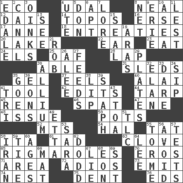 ACROSS 1. Environmental prefix 4. Allodial 8. Anneal 12. Raised platform 14. Literary convention 16. Celtic language 17. Queen of England 1702-14 18. Pleas 20. Member of a famous L.A. basketball team 22. Ewer handle 23. Ingest 24. Raised railways 25. Clumsy lout 28. Pet locale 30. Competent 31. Bobsleighs 35. Set 37. Snakelike fish 40. Mountain range southwest of Kyrgyzstan 41. Utensil 42. Proofreads 44. Canvas cover 45. Painter Guido (1575-1642) 46. Petty quarrel 47. Compass dir. 48. Come out of 50. Cooking vessels 52. Mountains (abbr.) 54. Actor Linden 55. Make lace 58. Call ___ day 61. Small boy 63. Garlic unit 65. Frustrating wastes of time 70. Greek god of love 71. Type of rug 72. Goodbye (Sp.) 73. Give off 74. A home for chicks 75. Scratch 76. Begley and Asner DOWN 1. Peak District village in England 2. Lessep's creation 3. Pig sounds 4. Shoshoni 5. Spanish title 6. Fitting 7. Old wives' tales, e.g. 8. Fish or hair follower 9. One of the Great Lakes 10. At sea 11. For fear that 13. Perceive with the eye 15. Lick closed 19. Ancient river in northeast Turkey 21. Director Reiner 26. Toward shelter 27. Gives food to 29. Food holders 30. Plant genus of onion and garlic 32. Liveliness 33. Have the gumption 34. Small drink 35. Moves 36. Immeasurably long periods of time 38. Mouth edge 39. Staphylococcus 41. Three (prefix) 43. Portico 49. Singer James 51. Affectionate concern, for short 53. "Two Mules for Sister ____" 55. Singer Mel 56. Stay clear from 57. Trials 58. SW Asia republic 59. Hoop that covers a wheel 60. Eras 62. Texas town _ City 64. Area sheltered from the wind 66. Floor protector 67. Untruth 68. Age 69. Fast jet (abbr.)