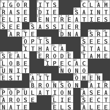 ACROSS 1. Russian composer Stravinsky 5. It is 8. Burrowing marine mollusk 12. Raze (variant) 13. Expire 14. Virtuous person 15. Writer Wiesel 16. Pleas 19. Perceive with the eye 20. More impudent 21. Johnson of "Laugh-In" 23. Heredity factor (abbr.) 24. Indian title of respect (Mr.) 27. Chooses 30. Perceives with the eye 31. New York city 34. Slanted text style (abbr.) 35. Lick closed 38. Wear away 40. Not wild 41. Ear part 42. Medicinal drug used to evoke vomiting 44. A single undivided whole 45. Words to Nanette 46. Eastern Standard Time (abbr.) 47. Small island 50. Sign of things to come 53. "Death Wish" actor 57. Wind 59. Census information 63. At sea 64. Came up 65. Whopper 66. Religious group 67. Nathan's nickname 68. Raised railways 69. Toward shelter DOWN 1. Angers 2. An organ shaped like a helmet 3. Flexible twig of a willow tree 4. To riddle 5. The content of cognition 6. Airtight sealed metal containers 7. Puts into a specified state 8. Feline 9. Cards in a Roman deck? 10. One (Scot) 11. Mountains (abbr.) 14. "Two Mules for Sister ____" 17. To free from 18. Car or cant ending 20. Back-to-school mo. 22. Bathroom 24. Stalk of a moss capsule 25. 480, 500 or 516 sheets of paper 26. Capri or Wright 28. Definite Article 29. Indian skirt 30. "Cheers" or "Ellen" 32. Police officer (slang) 33. An important port of Yemen 35. Turn sharply 36. Immeasurably long periods of time 37. "This won't hurt ____!" 39. Environmental prefix 43. Soon (poet.) 47. Competent 48. Lyricist Gershwin 49. Small child 51. Artist's stand 52. Sibling's daughter 54. "Death on the ____" 55. Land 56. Washington bills 58. Assign a rank or rating to 59. Baking dish 60. Mouth or opening 61. Plant holder 62. Purpose 63. White ___ sheet