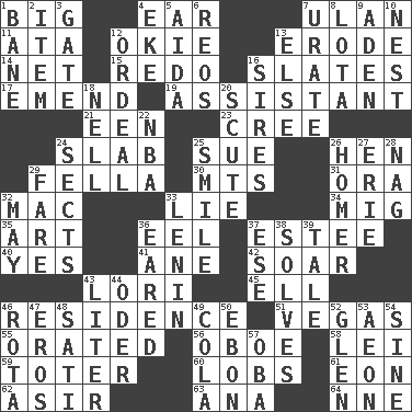 ACROSS 1. Massive 4. Hearing organ 7. Uhlan (variant) 11. "One Day ___ Time" 12. Migrant worker of the '30s 13. Wear away 14. Fish or hair follower 15. Make new 16. Chalkboards 17. Make improvements or corrections to 19. Aide 21. Car or cant ending 23. Algonquian 24. Thick slice 25. Institute legal proceedings 26. Layer 29. Chap (slang) 30. Mountains (abbr.) 31. Mouth or opening 32. Apple computer (short form) 33. Whopper 34. Russian fighter aircraft 35. Nonscientific branch of learning 36. Snakelike fish 37. First name in cosmetics 40. Consenting reply 41. One (Scot) 42. Fly high 43. Australian parrot (variant) 45. Pipe bend 46. Dwelling 51. Viva Las _ 55. Declaimed 56. Mitch Miller's instrument 58. Flowery wreath 59. Carrier 60. Tennis shots 61. Period of immesurable duration 62. SW Saudi Arabia district 63. Santa ___, CA 64. Compass dir. DOWN 1. Object of repulsion 2. Detail 3. Yard entry 4. Supplement with great effort 5. Opera by Verdi 6. Vintage cars 7. A salt of uric acid 8. Globular water bottle used in Asia 9. An important port of Yemen 10. A home for chicks 12. Severe or trying experience 13. Otherwise 16. Male parents of animals 18. 1994 drama film starring Jodie Foster 20. Scutum 22. Basketball assoc. 24. Religious groups 25. Grin 26. Home run 27. One of the Great Lakes 28. Tired old horse 29. Conductor's collection 32. Fifth month 33. Soviet premier 1918-24 36. Having ears or earlike features 37. Compass dir. 38. Finds the solution 39. Falsehood 43. 61 cubic inches 44. Baltic tributary 46. Roll call or roster of names 47. Greek god of love 48. Suttee (variant) 49. Root beer relative 50. Inky black, to poets 52. Small, secluded valley 53. A really long time 54. Trig term 57. Chief or king in Benin or Nigeria