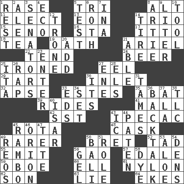 ACROSS 1. To erase 5. Three (prefix) 8. Keyboard modifier key 11. Opt 13. A really long time 14. Musical group of three 15. Sir (Sp.) 16. R.R. building 17. "Tell ____ the Marines!" 18. Beverage made from leaves 19. Pledge 21. Satellite of Uranus 22. Watch over 24. Fermented drink made from hops 25. Pressed 27. Snakelike fish 29. Small pie 30. An arm off of a larger body of water 32. Domed church section 33. _____ Park, CO 35. Blind as ____ 39. Amusement-park features 41. Promenade 42. Fast jet (abbr.) 43. Medicinal drug used to evoke vomiting 45. Round or rotation of duties 48. Keg 49. Less widely known 50. Cy Young winner Saberhagen 52. Small amount or degree 55. Send forth 56. E Mali city 57. Peak District village in England 59. Mitch Miller's instrument 60. Pipe bend 61. High-strength synthetic material 62. Manchild 63. Falsehood 64. Supplements with great effort DOWN 1. State of inaction 2. Toward shelter 3. Elected representatives 4. Environmental prefix 5. Trial 6. Writer of Portnoy's Complaint (1969) 7. _ tizzy (2 wds.) 8. Nick name for Arthur 9. 61 cubic inches 10. Utensil 12. Marketplace scale 14. Hoop that covers a wheel 20. Say or write further 21. Competent 23. Keyboard key 25. Call ___ day 26. Reproach for some lapse or misdeed 27. Compass dir. 28. Raised railways 30. It is 31. Makes less strong or intense 33. Begley and Asner 34. Arrange properly for use 36. Sass 37. Wing 38. Affectionate concern, for short 40. Austrian river, tributary to the Danube 43. Frozen water 44. Eucharist need 45. Role for Stallone 46. Greek mythologigal hunter 47. False hair 49. Vintage cars 50. Indonesian resort city 51. Hero or heavy, e.g. 53. Medicinal plant 54. Habitations of wild animals 56. Set 58. Color