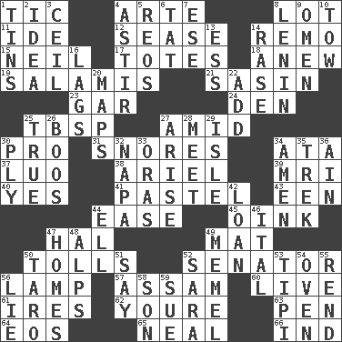ACROSS 1. Nervous spasm 4. Johnson of "Laugh-In" 8. Car dealer's back yard 11. Binary compound 12. Gospel singer Marvin 14. San ____ (Riviera town) 15. Famous astronaut Armstrong 17. Lugs 18. Afresh 19. Deli grouping 21. Indian antelope 23. Slender fish 24. Lair 25. Cook's measure (abbr.) 27. Among 30. Adept person 31. Sounds asleep 34. _ moment's notice (2 wds.) 37. Nilotic language 38. Satellite of Uranus 39. Medical imaging device (abbr.) 40. Consenting reply 41. Soft color 43. Car or cant ending 44. Comfort 45. Pig sound 47. Actor Linden 49. Floor covering 50. For Whom the Bell _____ 52. Elected representative 56. Desk light 57. Indian state 60. Not recorded 61. Angers 62. You are 63. Fenced enclosure 64. Greek goddess of the dawn 65. Be tempered by heat 66. Working for oneself (abbr.) DOWN 1. Metal containers 2. The content of cognition 3. To provide with a ceiling 4. Moving about 5. Vintage cars 6. Make lace 7. Compass dir. 8. Soviet premier 1918-24 9. Sign of things to come 10. Pull behind 13. Curvy letter 14. To erase 16. Falls behind 20. Atlas contents 22. Find the sum of 25. Loyal 26. Scornful sounds 27. Ascend 28. Rendezvous 29. Small island 30. Strand of rope, yarn or thread 32. California wine valley 33. Mouths or openings 34. So be it 35. Long journey 36. The 18th letter of the Arabic alphabet 42. Grant temporary use of 44. Pipe bend 46. Slanted text style (abbr.) 47. Residences 48. High mountains 49. Klaipeda city 50. Pacific island yam 51. Declare 52. "Two Mules for Sister ____" 53. Native american tent (variation) 54. Baking chamber 55. Tear apart 56. Whopper 58. Manchild 59. Institute legal proceedings