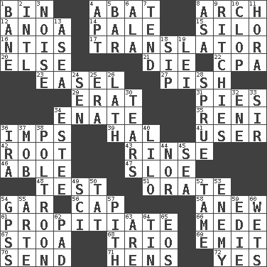 ACROSS 1. Storage container 4. Blind as ____ 8. Bowlike part 12. Small Philippine buffalo 14. Diluted with white 15. Grain storage tower 16. Nuclear Threat Initiatives 17. Interpreter 20. Otherwise 21. Pass on 22. Accounting whiz (abbr.) 23. Artist's stand 27. Expression of disdain 29. Part of Q.E.F. 31. Sliced desserts 34. Maternal 35. Painter Guido (1575-1642) 36. Naughty children 39. Actor Linden 41. One who makes use of a thing 42. Carrot, for example 43. Wash lightly 46. Competent 47. _ gin 48. Trial 51. Declaim 54. Slender fish 56. Head covering 58. Afresh 61. Conciliate 66. Ancient Persian 67. Portico 68. Musical group of three 69. Give off 70. Transmit 71. Coop moms 72. Consenting reply DOWN 1. Object of repulsion 2. International (abbr.) 3. Annoying sound 4. Fitting 5. Drinking establishment 6. According to 7. Be inclined (to) 8. White ___ sheet 9. Actors Guy, Robert Welles, and Clint 10. Hoof sound 11. Israeli folk dance 13. Toward the sea 18. Small drink 19. Flowery wreath 24. Elected rep. 25. Epoch 26. Thin strip of wood or metal 28. Disorder 30. Rends 32. Compass dir. 33. Title for a knight 34. First name in cosmetics 36. Retirement account (abbr.) 37. Disorderly crowd 38. Characterized by complete cowardliness 40. _ and Stitch 44. And not 45. Ocean 49. _-fi 50. Make lace 52. Not wild 53. Foe 54. Global Positioning Systems (abbr.) 55. Johnson of "Laugh-In" 57. Essential or central part 59. Singer Brickell 60. Soaks 62. Groovy apt. 63. "We ___ not amused" (Victoria) 64. Shallow baking pan 65. Greek goddess of the dawn