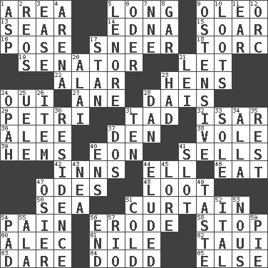 ACROSS 1. Length times width 5. Having great length 9. Margarine 13. Burn superficially 14. Pulitzer Prize-winning author Ferber 15. Fly high 16. Airs 17. Contemptuous expression 18. Torque (variant) 19. Legislator 21. Allow 22. Having or resembling wings 23. Coop moms 24. Fr. "Yes" 27. A saturated hydrocarbon 28. Raised platform 29. _ dish (used to culture cells) 31. Small amount or degree 32. Austrian river, tributary to the Danube 36. Toward shelter 37. Lair 38. Short-tailed, large-bodied rat 39. Cloth borders 40. Period of immesurable duration 41. Exchanges for money 42. Taverns 44. Pipe bend 46. Consume 47. Lyric poems 48. Spoils 50. Ocean 51. Window treatment 54. Ache 56. Eat (away) 58. Obstruct or block passage 60. Actor Baldwin 61. "Death on the ____" 62. "Change" in Tahitian 63. Have the gumption 64. Texas town _ City 65. Otherwise DOWN 1. Cleo's killer 2. Vintage cars 3. Relaxation 4. Sports stadium 5. Poe poem 6. River in Europe 7. Compass dir. 8. Slender fish 9. Clearly or manifestly demonstrative 10. Plunders 11. Ewer handle 12. The grampus (Milton) 17. Comedian Laurel of Laurel & Hardy 20. Jai ____ 21. Luau accessory 23. Possessed 24. Brightly colored fish 25. Ubangi River tributary 26. Detail 28. Daniel's nick name 30. Home 31. Nine, plus one 33. Not divided or shared with others 34. Silent film actress Nazimova 35. Remainder 37. Two (Sp.) 40. Followers of ems 41. Groove 43. Teachers' org. 44. Evaded 45. Old wives' tales, e.g. 47. Flexible twig of a willow tree 49. Clothes sense 51. Lacking warmth 52. Slanted text style (abbr.) 53. Common sense 54. Groovy apt. 55. In the manner of 56. Conclude 57. _ de Janeiro 59. Sliced dessert