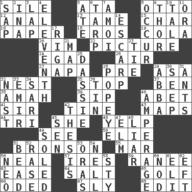 ACROSS 1. Filth; sediment 5. _ moment's notice (2 wds.) 8. Von Bismarck 12. Of or related to the anus 13. Docile 15. Burn to charcoal 16. Some stationery 18. Greek god of love 19. Root beer relative 20. Zeal 22. Photo 24. Mild oath 26. Atmosphere 27. California wine valley 28. Before (prefix) 29. White ___ sheet 32. A home for chicks 35. Cease 37. Benjamin's nick name 38. Nursemaid 39. Small drink 40. Collude with 41. Title for a knight 42. Prong on a fork 43. Atlas contents 44. Three (prefix) 45. A female animal or person 46. Sharp bark 49. Observe 50. Writer Wiesel 51. "Death Wish" actor 55. Spoil 56. Actress Patricia 57. Angers 59. The wife of a rajah (variant) 63. Comfort 64. Table seasoning 65. _ course 66. Wrote a lyric poem 67. Cunning 68. Prepare for publication DOWN 1. Plant excrement 2. _ tizzy (2 wds.) 3. Infant locale 4. Veterans Day date 5. Had dinner 6. Canvas cover 7. Mine, in Marseilles 8. Happen 9. Son of Odin 10. Story 11. Mouth or opening 14. Fortification 17. Port city in Latvia 21. Atlas unit 23. Make a knot 25. Small ungulate mammals of Africa 28. Wimpy's pal 29. Swedish rock group 30. Ooze 31. Pismires 32. Political cartoonist Thomas 33. Independent ruler or chieftain 34. Indian skirt 36. Shallow baking pan 40. Electrical Measurement 42. College paper 45. Elected rep. 47. Shade tree 48. One who doesn't tell the truth 49. Having a sole or soles 51. Necklace unit 52. Raze (variant) 53. Mouths or openings 54. 1994 drama film starring Jodie Foster 56. Modern: prefix 58. Filthy place 60. Allow head to fall sleepily 61. Connecticut Ivy Leaguer 62. Newt