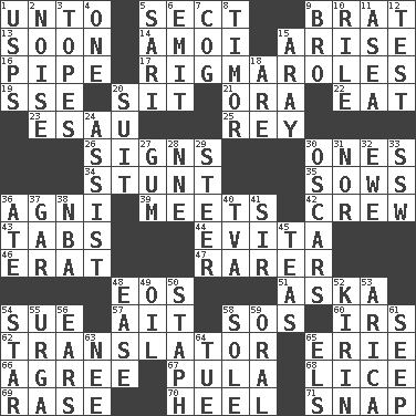 ACROSS 1. To (old English) 5. Religious group 9. Naughty child 13. Within a short period 14. Mine, in Marseilles 15. Get up 16. Corncob 17. Frustrating wastes of time 19. Compass dir. 20. Be seated 21. Mouth or opening 22. Ingest 23. He sold his birthright 25. Marina Del _, California 26. Attaches a signature 30. Washington bills 34. Difficult or unusual or dangerous feat 35. Sty mamas 36. Hindu god of fire 39. Confronts 42. Ship's personnel 43. Bar bills 44. Webber/Rice musical 46. Part of Q.E.F. 47. Less widely known 48. Greek goddess of the dawn 51. "____ silly question..." 54. Take to court 57. Small island 58. Mayday 60. Big collection agency 62. Interpreter 65. 4th largest of the Great Lakes 66. Match 67. Monetary unit of Botswana 68. Louse (plural) 69. Raze (variant) 70. Person who is morally reprehensible 71. Fastener DOWN 1. United States Postal Service (abbr.) 2. Annoying sound 3. Drinks excessively 4. Single 5. Indian skirt 6. Give off 7. Gear tooth 8. The easternmost of the Lesser Sundas 9. Sis' sibling 10. Cause heat under the collar 11. At sea 12. Trial 15. Like ___ of sunshine 18. "We ___ not amused" (Victoria) 20. Set of matching outer garments 24. Help 27. Chewing product 28. Compass dir. 29. Bull 30. Motion picture awards 31. Not either 32. She-sheep 33. Compass dir. 36. Had dinner 37. Slender fish 38. Basketball assoc. 40. Federal power corp. 41. Title for a knight 45. Afternoon social gatherings 48. Relaxation 49. Lubricate 50. Staphylococcus 52. Japanese brewing company 53. N. Chile seaport 54. Play the lead 55. Capital and largest city of Mongolia 56. Hearing organs 58. Not divided or shared with others 59. Of the mouth 61. Ooze 63. Born 64. Third day of the wk. 65. Raised railways