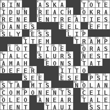 ACROSS 1. Storage container 4. "____ silly question..." 8. Lug 12. Goddess of spring and wife of Bragi 14. Arrive at 16. Gumbo ingredient 17. French philosopher Descartes 18. Pleas 20. Natives or inhabitants of Denmark 22. Snakelike fish 23. Lizard (obsolete) 24. Mischievous 25. Double-curved letter 28. Mouth edge 30. Detail 31. _____ steamer (cargo ship) 35. Car dealer's back yard 37. Event that recurs at intervals 40. Mouths or openings 41. Baby powder 42. Runs notes together 44. Egg locale 45. Nursemaid 46. Immeasurably long periods of time 47. Make lace 48. Put off 50. "Tell ____ the Marines!" 52. Observe 54. Compass dir. 55. Air pressure measure (abbr.) 58. R.R. building 61. Mountains (abbr.) 63. Pitcher Ryan 65. Parts 70. To provide with a ceiling 71. Margarine 72. Approach 73. Lie 74. Portable shelter 75. "Change" in Tahitian 76. Fast jet (abbr.) DOWN 1. Avian creatures 2. Perfect 3. Pet term 4. "We ___ not amused" (Victoria) 5. Elected rep. 6. Krazy ___ of comics 7. 43,560 square feet 8. Small child 9. Migrant worker of the '30s 10. Not kosher 11. Compass direction 13. Born 15. The bottom of a shoe or boot 19. Set down 21. Arrange properly for use 26. Arranges properly for use 27. Grin 29. Right away 30. Strong, restless desires 32. Length times width 33. Vertical spar for supporting sails 34. Pacific Standard Time (abbr.) 35. Unable to walk 36. Norwegian king 38. Superhero pair 39. Bert's buddy 41. Bit 43. Fast planes 49. San ____ (Riviera town) 51. Nine, plus one 53. Inactive volcano in Sicily 55. Entreaties 56. Moves on water 57. An arm off of a larger body of water 58. Highlander 59. Lacquered or enameled metalware 60. So be it 62. Transmitted 64. Sep. follower 66. Plant holder 67. Teachers' org. 68. The 19th letter of the Greek alphabet 69. Indian title of respect (Mr.)