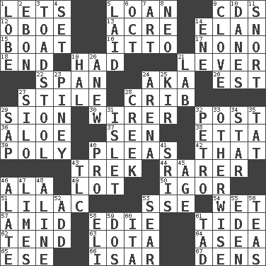 ACROSS 1. Allows 5. Grant temporary use of 9. Music discs 12. Mitch Miller's instrument 13. 1/640 square mile 14. Style 15. Water vessel 16. "Tell ____ the Marines!" 17. Words to Nanette 18. Conclusion 19. Possessed 21. Prying instrument 22. Connect, as a bridge 24. Alias (abbr.) 26. Eastern Standard Time (abbr.) 27. Vertical member of a panel or frame 28. Baby bed with high sides 29. The Jewish people; Israel 30. One who wires 32. Mail 36. Medicinal plant 37. Elected rep. 38. Singer James 39. More than one (prefix) 40. Entreaties 42. Not this but _ 43. Long journey 44. More uncommon 46. Chicken ___ king 49. Car dealer's back yard 50. Composer Stravinsky 51. Pale purple color 53. Compass dir. 54. Soggy 57. Among 58. Singer Brickell 61. Periodic rise and fall of the sea level 62. Look after 63. Globular water bottle used in Asia 64. At sea 65. Compass dir. 66. Austrian river, tributary to the Danube 67. Hiding places for outlaws DOWN 1. Ear part 2. Inky black, to poets 3. Inedible or poisonous agaric 4. Put into a specified state 5. Put down 6. Sep. follower 7. Nonscientific branch of learning 8. Modern: prefix 9. Garlic unit 10. Natives or inhabitants of Denmark 11. Derisive sound 14. Compass dir. 19. Actor Linden 20. Afresh 21. Experiment locale 23. Abounding in pines 24. Sports stadium 25. Apertif with cassis 27. Grain storage tower 28. Small stream 29. Plant excrement 31. Small island 32. Stone: prefix 33. Else 34. Play the lead 35. Make lace 40. Adept person 41. Indian titles of respect 43. Affectionate concern, for short 45. Ripen 46. Having winglike extensions 47. Citrus fruits 48. Place in a line 52. Say or write further 53. Shrivel 55. Paradise 56. Beverages made from leaves 58. Connecticut Ivy Leaguer 59. Two (Sp.) 60. Call ___ day 61. Small boy