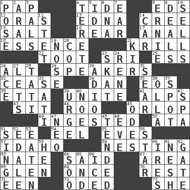 ACROSS 1. Infant food 4. Event that recurs at intervals 8. Begley and Asner 11. Mouths or openings 13. Pulitzer Prize-winning author Ferber 14. Algonquian 15. Table seasoning 16. Stern 17. Of or related to the anus 18. Gist 21. The principal food of baleen whales 22. A blast of a horn 23. _ Lanka 25. Double-curved letter 26. Keyboard modifier key 29. Orators 32. Desist 34. Daniel's nick name 35. Greek goddess of the dawn 38. Singer James 39. Join together 41. High mountains 43. Be seated 44. Friend of Pooh 45. Lowest deck of a ship 46. Consumed 50. "One Day ___ Time" 51. Observe 54. Snakelike fish 55. Nights before holidays 57. Potato state 59. Inhabiting a nest 63. Nathan's nickname 64. Expressed in words 67. Type of rug 68. Small, secluded valley 69. At one time in the past 70. Respite 71. Car or cant ending 72. Wrote a lyric poem 73. A female animal or person DOWN 1. Introduce or present, as a question 2. Caspian sea tributary 3. Friends 4. Cylindrical with tapered ends 5. Binary compound 6. Heredity factor (abbr.) 7. Hearing organ 8. Bert's buddy 9. Allots cards 10. Makes a sale 12. Proofreading order 14. 4-wheeled motor vehicle 19. Sense of smell 20. Police officer (slang) 21. Apertif with cassis 23. Three-handed card game 24. French philosopher Descartes 26. Adept person 27. Allows 28. Jacques of French films 30. Goodbye (Sp.) 31. Singe 33. Suttee (variant) 36. Rounded earthenware pot or jar 37. Blemish 39. Goad 40. Christmas carol 42. Health resort 45. Lyric poems 47. Modern: prefix 48. Watched over 49. First lady 51. Scorch 52. Peak District village in England 53. Consumed 56. Play the lead 58. Layer 60. Angers 61. Soft 62. Yard entry 64. "Barney Miller" actor Jack 65. Added to 66. Frozen water
