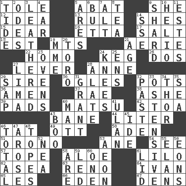 ACROSS 1. Lacquered or enameled metalware 5. Blind as ____ 9. A female animal or person 12. The main thing one is thinking about 13. Court order 14. "______ My Girl" (Turtles hit) 15. Letter starter 16. Singer James 17. Table seasoning 18. Eastern Standard Time (abbr.) 19. Mountains (abbr.) 21. Nest on high 22. Like (prefix) 24. Barrel 26. Two (Sp.) 27. Prying instrument 28. Singer Murray 29. Male parent of an animal 30. Stares at amorously 32. Cooking vessels 36. So be it 37. Actress Charlotte 38. American tennis player Robert 39. Writing tablets 40. Taiwanese island in East China Sea 42. Portico 43. Object of repulsion 44. 61 cubic inches 46. Make lace 49. Baseball player Mel 50. Arabian gulf 51. U. of Maine site 53. A saturated hydrocarbon 54. Observe 57. Drink excessively 58. _ vera 61. _ and Stitch 62. Toward the sea 63. Western Nevada city 64. _ the terrible 65. French article 66. Genesis locale 67. Hiding places for outlaws DOWN 1. Event that recurs at intervals 2. Lyric poems 3. Resembling or made to resemble leather 4. Ewer handle 5. Ancient Greek god of war 6. On the contrary 7. The first octave above the treble staff 8. Beverage made from leaves 9. Pottery fragment 10. Sun: prefix 11. _____ Park, CO 14. Compass dir. 19. Madame (abbr.) 20. "Corrida" creature 21. Personal question 23. Baking chambers 24. Leg joints 25. Followers of ems 27. Pale green bean 28. Having winglike extensions 29. Plant excrement 31. Let have 32. Thick mixture 33. Clearly or manifestly demonstrative 34. Son of Odin 35. Ocean 40. Floor covering 41. ____ Bator 43. Surprise greeting 45. Binary compound 46. Add up to 47. Came up 48. Drinks excessively 52. Teachers' org. 53. Period of immesurable duration 55. Liveliness 56. Immeasurably long periods of time 58. "We ___ not amused" (Victoria) 59. Directed 60. Single 61. Flaplike covering