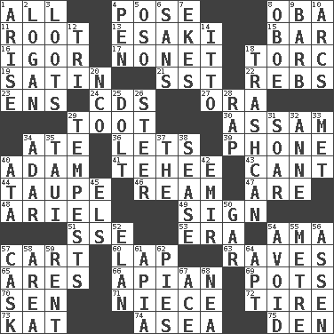 ACROSS 1. 100% 4. Airs 8. Chief or king in Benin or Nigeria 11. Carrot, for example 13. 1973 Nobel Price Winner (Physics) Leo 15. Oblong piece of solid material 16. Russian composer Stravinsky 17. Music written for nine 18. Torque (variant) 19. Smooth fabric 21. Fast jet (abbr.) 22. Confederate soldiers (slang) 23. Followers of ems 24. Music discs 27. Mouth or opening 29. A blast of a horn 30. Indian state 34. Had dinner 36. Allows 39. Give a jingle 40. First of billions? 41. Giggle 43. Patter 44. Grayish beige 46. 480, 500 or 516 sheets of paper 47. "We ___ not amused" (Victoria) 48. Satellite of Uranus 49. Attach a signature 51. Compass dir. 53. Epoch 54. Nanny (var.) 57. Haul 60. Infant locale 63. All-night dance parties 65. Ancient Greek god of war 66. Bee-related 69. Cooking vessels 70. Elected rep. 71. Sibling's daughter 72. Become fatigued 73. Krazy ___ of comics 74. At sea 75. Lair DOWN 1. Ascend 2. Utah city north of Ogden 3. Plunders 4. Animal enclosure 5. Bear (Spanish) 6. Without 7. Supplements with great effort 8. Mitch Miller's instrument 9. Sharp remark 10. Arches 12. Three (prefix) 14. "Tell ____ the Marines!" 18. File 13 20. Non-commissioned officer (abbr.) 25. Dunce 26. Bull 28. Reproach for some lapse or misdeed 29. Storms 31. Fly high 32. Queen of England 1702-14 33. Was introduced to 34. The sixth month of the Jewish calendar 35. "Change" in Tahitian 37. Definite Article 38. Gospel singer Marvin 40. _ moment's notice (2 wds.) 42. Arab leader 45. Raised railways 50. Slender fish 52. Style 54. Shun 55. Distance measurement (Brit.) 56. NE Netherlands city 57. Keg 58. Length times width 59. Monthly bill 61. Capital of Western Samoa 62. Sliced desserts 64. Fitting 67. Adept person 68. Teachers' org.