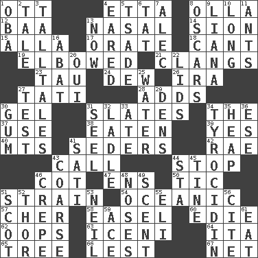 ACROSS 1. Baseball player Mel 4. Singer James 8. Rounded earthenware pot or jar 12. Sound made by sheep 13. Relating to the nose 14. The Jewish people; Israel 15. Silent film actress Nazimova 17. Declaim 18. Patter 19. Turned at an angle; bent 21. Gives out a loud, resonant sound 23. The 19th letter of the Greek alphabet 24. Morning condensation 26. Lyricist Gershwin 27. Jacques of French films 28. Does sums 30. Set 31. Chalkboards 34. Definite Article 37. Purpose 38. Eroded 39. Consenting reply 40. Mountains (abbr.) 41. Spring feasts 42. Actress Charlotte 43. Give a ring to 44. Halt 46. Small bed 47. Followers of ems 50. Nervous spasm 51. Put through a sieve 54. Pertaining to the sea 57. "Mermaids" star 58. Artist's stand 60. Singer Brickell 62. I made a mistake 63. Ancient Celtic tribe of eastern Britain 64. Call ___ day 65. Relationship diagram 66. For fear that 67. Fish or hair follower DOWN 1. Chief or king in Benin or Nigeria 2. Lie 3. Baron Munchausen's specialties 4. Having ears or earlike features 5. Sadhe (variant) 6. Make lace 7. Actor Baldwin 8. Motion picture awards 9. Woody, climbing, usually tropical plant 10. Yearn 11. Pismires 13. Immediately 16. Blind as ____ 20. Fr. "Yes" 22. Flaplike coverings 25. Wetness 27. Trial 29. Hiding places for outlaws 30. Chewing product 31. Stitch closed the eyes of (a falcon) 32. Dipping utensil 33. Had dinner 34. Polypeptide antibiotic 35. Pile 36. Compass dir. 41. Suttee (variant) 43. Rough 44. R.R. building 45. Prong on a fork 46. Streamer paper 48. Olfactory organs 49. Odor 51. Highlander 52. Son of Odin 53. Famous astronaut Armstrong 55. Biblical high priest 56. Quote 59. Adept person 61. Ingest