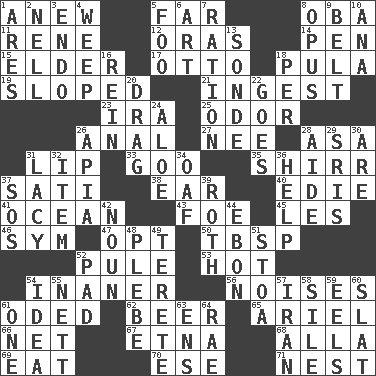 ACROSS 1. Afresh 5. At a great distance 8. Chief or king in Benin or Nigeria 11. French philosopher Descartes 12. Mouths or openings 14. Animal enclosure 15. A person who is older than you are 17. "Beetle Bailey" pooch 18. Monetary unit of Botswana 19. Slanted 21. Eat 23. Retirement account (abbr.) 25. Scent 26. Of or related to the anus 27. Born 28. White ___ sheet 31. Mouth edge 33. Thick or sticky substance 35. Bake eggs in their shells 37. Suttee (variant) 38. Hearing organ 40. Singer Brickell 41. Sea 43. Enemy 45. French article 46. Symbol (abbr.) 47. Choose 50. Cook's measure (abbr.) 52. Whimper 53. Being at a high temperature 54. Sillier 56. Annoying sounds 61. Wrote a lyric poem 62. Fermented drink made from hops 65. Satellite of Uranus 66. Fish or hair follower 67. Inactive volcano in Sicily 68. Silent film actress Nazimova 69. Ingest 70. Compass dir. 71. Egg locale DOWN 1. Ancient Greek god of war 2. 1994 drama film starring Jodie Foster 3. Inside; within (prefix) 4. Shed a tear 5. Egg _ yung 6. Tate display 7. Food allowance for one day 8. Musical composition 9. Waist strap 10. Santa ___, CA 13. Message 16. It's straight from the horse's mouth 18. For each 20. To trail on the ground 22. Moves 24. Medicinal plant 26. Capital of Western Samoa 28. Assistant 29. Indian titles of respect 30. "We ___ not amused" (Victoria) 31. Made of lace 32. A whole individual unit 34. Clumsy lout 36. Assist 37. Distress signal 39. Writer of Portnoy's Complaint (1969) 42. Part of speech 44. Inky black, to poets 48. First-year military academy student 49. Cigar-shaped 51. Portico 52. Writing tablet 54. It may be bright or harebrained 55. Remaining after all deductions 57. SW Asia republic 58. Drop; flow; fall 59. Snakelike fish 60. Narrow board 61. Single 63. Followers of ems 64. Actress Charlotte