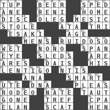 ACROSS 1. Uncastrated adult male sheep 4. Fermented drink made from hops 8. Hurried 12. One (Scot) 13. Painter Guido (1575-1642) 14. Dwelling 15. Flat circle 17. Cassini of fashion 18. Mesonic 19. Took without asking 21. "One Day ___ Time" 23. Three (prefix) 24. 1973 Nobel Price Winner (Physics) Leo 26. Grow older 28. Not women's 30. Noisy, rowdy, vocal (Spanish) 34. Soggy 37. Words to Nanette 39. Connect, as a bridge 40. Sight organ 41. Bobsleighs 43. "We ___ not amused" (Victoria) 44. Ancient Greek god of war 46. Raised platform 47. Part of HMS, perhaps 48. Small, flat, pigmented spot on the skin 51. Nuclear Threat Initiatives 54. Santa ___, CA 55. Don Adams' spy role 58. Shoshoni 61. Heredity factor (abbr.) 63. Entreaties 65. Cowboy competition 67. Nathan's nickname 71. Drawn tight 72. Went 73. Unclean, religiously 74. Numbers guy (abbr.) 75. Liveliness 76. Scram! 77. Layer DOWN 1. Bits 2. Join together 3. Mexican monetary units 4. Sis' sibling 5. Snakelike fish 6. Compass dir. 7. Capital of Latvia 8. A female animal or person 9. Mail 10. Arab leader 11. Tenth: prefix 16. Dollar (slang) 18. Wise men 20. Supplement with great effort 22. The 19th letter of the Greek alphabet 25. Taverns 27. Begley and Asner 29. Twentieth part of a lira 30. "The Thinker" sculptor 31. Brightly colored fish 32. Indian skirt 33. Washington bills 34. Welt 35. Jane of fiction 36. Adolescent 38. Teachers' org. 42. Fast planes 45. R.R. building 49. Southeast Asian peninsula 50. Separate the seeds from cotton 52. Naughty child 53. Table seasoning 56. Arrive at 57. Grayish beige 58. Goad 59. Utensil 60. Pulitzer Prize-winning author Ferber 62. Pismires 64. Comedian Laurel of Laurel & Hardy 66. Car or cant ending 68. Curve 69. Afternoon social gathering 70. Bank Draft (abbr.)