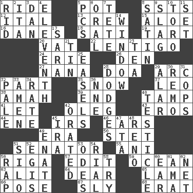 ACROSS 1. Travel on or in a vehicle 5. Plant holder 8. Fast planes 12. Slanted text style (abbr.) 13. Ship's personnel 15. _ vera 16. Natives or inhabitants of Denmark 18. Suttee (variant) 19. Small pie 20. Large container 22. Small, flat, pigmented spot on the skin 24. One of the Great Lakes 26. Lair 27. Grandmother 28. ___ good deed 29. Curve 32. Component 35. Frozen precipitation 37. Lion 38. Nanny 39. Conclude 40. Pack (down) 41. Allow 42. Cassini of fashion 43. Greek god of love 44. Compass dir. 45. Big collection agency 46. Hearing organs 49. Epoch 50. Proofreading order 51. Legislator 55. Cuckoo 56. Port city in Latvia 57. Prepare for publication 59. Sea 63. Set down 64. Letter starter 65. Unable to walk 66. Airs 67. Mischievous 68. Part of Q.E.F. DOWN 1. To free from 2. Call ___ day 3. One of the 12 tribes of Israel 4. Veterans Day date 5. Personal Computers (abbr.) 6. Taken by mouth 7. False hair 8. Smooth fabric 9. Volcanic refuse 10. "Corrida" creature 11. Arrange properly for use 14. Light entry point 17. "Two Mules for Sister ____" 21. Metal container 23. Afternoon social gathering 25. Artist's stands 28. Evades 29. Having or resembling wings 30. San ____ (Riviera town) 31. 911 reaches them 32. Light colored 33. So be it 34. Pace 36. Compass dir. 40. One of the two male reproductive glands 42. Declaimed 45. Retirement account (abbr.) 47. _ moment's notice (2 wds.) 48. Western Nevada city 49. Related on the mother's side 51. Grain storage tower 52. The front part of a cuirass 53. Lyric poems 54. Monetary unit of Yemen 56. Strike 58. Attempt to accomplish something 60. Hearing organ 61. Nanny (var.) 62. Fish or hair follower