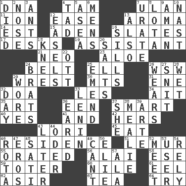ACROSS 1. Heredity factor (abbr.) 4. Scottish cap 7. ____ Bator 11. Electrically charged atom 12. Comfort 13. Scent 14. Eastern Standard Time (abbr.) 15. An important port of Yemen 16. Chalkboards 17. Writing tables 19. Aide 21. Modern: prefix 23. _ vera 24. Waist strap 25. Pipe bend 26. Compass dir. 29. Obtain by seizing forcibly or violently 30. Mountains (abbr.) 31. Compass dir. 32. ___ good deed 33. French article 34. Small island 35. Nonscientific branch of learning 36. Car or cant ending 37. Don Adams' spy role 40. Consenting reply 41. Plus 42. Possessive pronoun 43. Australian parrot (variant) 45. Erode 46. Home 51. Arboreal primate 55. Declaimed 56. Mountain range southwest of Kyrgyzstan 58. Compass dir. 59. Carrier 60. "Death on the ____" 61. Snakelike fish 62. SW Saudi Arabia district 63. Beverage made from leaves 64. Attempt to accomplish something DOWN 1. Passed on 2. Characteristic smell of wine 3. Pismires 4. Bit 5. Toward the sea 6. Not women's 7. A salt of uric acid 8. Globular water bottle used in Asia 9. So be it 10. Political cartoonist Thomas 12. Artist's stands 13. In addition 16. Beverly of Met fame 18. Leg joint 20. Table seasonings 22. Baseball player Mel 24. Naughty children 25. Make improvements or corrections to 26. Puts on (as clothing) 27. In a ____ (agitated or irritated) 28. Soggy 29. Had on 32. 24 hours 33. Soviet premier 1918-24 36. Having ears or earlike features 37. A female animal or person 38. Ear of corn 39. Johnson of "Laugh-In" 43. 61 cubic inches 44. Baltic tributary 46. Roll call or roster of names 47. Greek god of love 48. Suttee (variant) 49. Patter 50. Writer Wiesel 52. Rendezvous 53. One who uses or employs something 54. Depend 57. According to