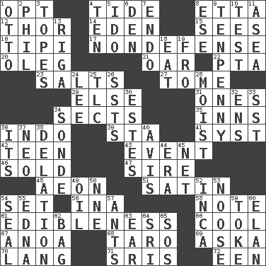 ACROSS 1. Elect 4. Periodic rise and fall of the sea level 8. Singer James 12. Son of Odin 14. Locale of original sin 15. Observes 16. Native american tent (variation) 17. Unrelated to defense, as in spending 20. Cassini of fashion 21. Boat paddle 22. Parent Teacher Assoc. 23. Table seasonings 27. Heavy book 29. Otherwise 31. Washington bills 34. Religious groups 35. Restaurants 36. _ china 39. R.R. building 41. System (abbr.) 42. Adolescent 43. Happening 46. Exchanged or delivered for money 47. Male parent of an animal 48. Period of immesurable duration 51. Smooth fabric 54. Put into a specified state 56. _ tizzy (2 wds.) 58. Short letter 61. The property of being fit to eat 66. Calm and collected 67. Small Philippine buffalo 68. Edible starchy tuberous root 69. "____ silly question..." 70. Austrian-born American filmmaker Fritz 71. Indian titles of respect 72. Car or cant ending DOWN 1. "Beetle Bailey" pooch 2. Silvers or Donahue 3. Drinks excessively 4. "___ Little Indians" 5. Wedding promise 6. Lair 7. Inside; within (prefix) 8. Compass dir. 9. 3-inch nail 10. Trial 11. Toward the sea 13. Capital of Latvia 18. Consume 19. From 24. Area sheltered from the wind 25. Affectionate concern, for short 26. Fast planes 28. Wet 30. _____ Park, CO 32. Followers of ems 33. Fast jet (abbr.) 34. Something which is sent 36. It is 37. Modern: prefix 38. Accusation by an informer 40. Deliberation 44. Period 45. Fish or hair follower 49. Lubricate 50. Compass dir. 52. South American Indian 53. Trap for birds or small mammals 54. Lick closed 55. Pulitzer Prize-winning author Ferber 57. Pismires 59. Casino tip 60. Flair 62. Container for groceries 63. Hearing organ 64. _ Lanka 65. Mayday