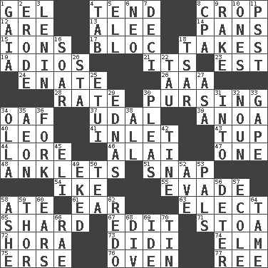 ACROSS 1. Set 4. Look after 8. Riding implement 12. "We ___ not amused" (Victoria) 13. Toward shelter 14. Zero-star reviews 15. Charged particles 17. Alliance 18. Receives possession of 19. Goodbye (Sp.) 21. It is 23. Eastern Standard Time (abbr.) 24. Related on the mother's side 26. Auto club (abbr.) 28. Pace 30. Puckering 34. Clumsy lout 37. Allodial 39. Small Philippine buffalo 40. Lion 41. An arm off of a larger body of water 43. Uncastrated adult male sheep 44. Old wives' tales, e.g. 46. Jai _ 47. Single 48. Short socks 51. Fastener 54. Mamie's husband 55. Elude 58. Had dinner 61. Hearing organ 63. Choose 65. Pottery fragment 67. Prepare for publication 71. Portico 72. Israeli folk dance 73. "You Light Up My Life" star Conn 74. Shade tree 75. Celtic language 76. Baking chamber 77. To riddle DOWN 1. Greek goddess of the earth (variant) 2. Eat (away) 3. Soviet premier 1918-24 4. Keyboard key 5. Pipe bend 6. Modern: prefix 7. Tenth: prefix 8. Numbers guy (abbr.) 9. Immoral or dissolute person 10. Washington bills 11. Inconspicuous attention getter 16. Fly high 18. Russian ruler of old 20. R.R. building 22. The 19th letter of the Greek alphabet 25. Needle holder 27. White ___ sheet 29. Ferber et al. 30. Entreaties 31. To the inside or interior of 32. Part of speech 33. Open wide 34. Water jar 35. Period of immesurable duration 36. Tined utensil 38. 100% 42. Prong on a fork 45. Connecticut Ivy Leaguer 49. Made supply last 50. Afternoon social gathering 52. "___ Maria" 53. Friends 56. Prevent from occurring 57. Learning spot: Fr. 58. American tennis player Robert 59. Son of Odin 60. Hearing organs 62. Make new 64. Docile 66. Actress Charlotte 68. HTML Container Element 69. Binary compound 70. Metal container