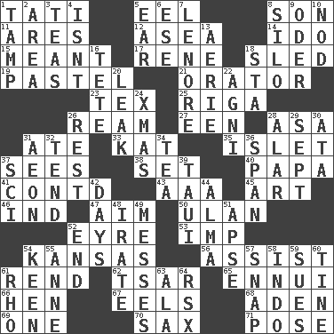 ACROSS 1. Jacques of French films 5. Snakelike fish 8. Male offspring 11. Ancient Greek god of war 12. Toward the sea 14. Wedding promise 15. Intended 17. French philosopher Descartes 18. Downhill vehicle 19. Soft color 21. Speaker 23. John Ritter's dad 25. Capital of Latvia 26. 480, 500 or 516 sheets of paper 27. Car or cant ending 28. White ___ sheet 31. Had dinner 33. Krazy ___ of comics 35. Small island 37. Perceives with the eye 38. Put into a specified state 40. Dad 41. Continued (abbr.) 43. American Automobile Association (abbr.) 45. Tate display 46. Working for oneself (abbr.) 47. Direct toward a target or goal 50. Uhlan (variant) 52. Jane of fiction 53. Mischievous child 54. Sunflower state 56. Aid 61. Tear apart 62. Russian ruler of old 65. World-weariness 66. Layer 67. Snakelike fish 68. Arabian gulf 69. Single 70. Saxophone 71. Introduce or present, as a question DOWN 1. Pack (down) 2. Length times width 3. Beverages made from leaves 4. Is not 5. Hearing organ 6. Compass dir. 7. Poe poem 8. Grain storage tower 9. River in Europe 10. Dreamland 13. Nest on high 16. Wig 18. R.R. building 20. Path through which fluid escapes 22. Hindu god of fire 24. Dec. holiday 26. State of inaction 28. Having or resembling wings 29. Back-to-school mo. 30. _ moment's notice (2 wds.) 31. Period of immesurable duration 32. Be inclined (to) 34. Afternoon social gathering 36. Connect, as a bridge 37. _-fi 39. "Change" in Tahitian 42. 24-hour periods 44. _ mater 48. Feeling or showing extreme anger 49. Makes clutter 51. Domed church section 52. Conclusion 54. Peachy ____! 55. Queen of England 1702-14 57. Fastener 58. Southeast Asian peninsula 59. Takes to court 60. Prong on a fork 61. 17th letter of the Greek alphabet 63. Insect wing 64. Acura sports coupe