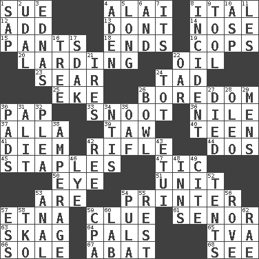 ACROSS 1. Take to court 4. Mountain range southwest of Kyrgyzstan 8. Slanted text style (abbr.) 12. Increase 13. Do not 14. Sense of smell 15. Leg coverings 18. Extremities 19. 911 reaches them 20. Preparing or cooking with lard 22. Lubricate 23. Burn superficially 24. Bit 25. Make supply last 26. Mood resulting from idleness 30. Infant food 33. Snout, nose 36. Mediterranean tributary 37. Silent film actress Nazimova 39. The 23rd letter of the Hebrew alphabet 40. Adolescent 41. South Vietnam president (1954) 42. Ransack; plunder; pillage 44. Two (Sp.) 45. Paper fasteners 47. Nervous spasm 50. Sight organ 51. A single undivided whole 53. "We ___ not amused" (Victoria) 54. Hard copy producer 57. Inactive volcano in Sicily 59. A slight indication 61. Sir (Sp.) 63. Heroin 64. Friends 65. Federal power corp. 66. Not divided or shared with others 67. Blind as ____ 68. Observe DOWN 1. Plant excrement 2. Freehold land 3. Ferber et al. 4. Arabian gulf 5. Protracted 6. Plus 7. ___ a Wonderful Life 8. Happening 9. Utensil 10. Cleo's killer 11. French article 16. Relationship diagram 17. Neighbor of Neb. 21. Angers 22. Rowing implement 24. Small child 26. Soup holder 27. Passed on 28. Butter sub 29. Not women's 30. Groovy apts. 31. Set down 32. Entreaty 34. Nuclear Threat Initiatives 35. Clumsy lout 38. Electrical Measurement 42. To separate or throw off 43. Needle holder 46. Sodium hydroxide 48. Taverns 49. Quote 52. Portable shelters 53. Of or related to the anus 54. Monetary unit of Botswana 55. State of inaction 56. Be footloose 57. Curvy letter 58. Ring climax 59. Accounting whiz (abbr.) 60. Experiment locale 62. Actress Charlotte