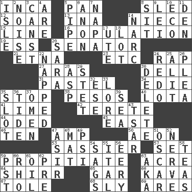 ACROSS 1. South American Indian 5. Baking dish 8. Downhill vehicle 12. Fly high 13. _ tizzy (2 wds.) 14. Sibling's daughter 15. Actor's bit 16. Census information 19. Double-curved letter 20. Legislator 21. Inactive volcano in Sicily 23. And so on (abbr.) 24. Reproach for some lapse or misdeed 27. Caspian sea tributary 30. Small valley 31. Soft color 34. Singer Brickell 35. Discontinue 38. Mexican monetary units 40. Globular water bottle used in Asia 41. Welles in "The Third Man" 42. Cylindrical with tapered ends 44. Wrote a lyric poem 45. 90 degrees 46. Nine, plus one 47. Electrical Unit 50. Period of immesurable duration 53. More disrespectful 57. Put into a specified state 59. Appease 63. Measure of real estate 64. Bake eggs in their shells 65. Slender fish 66. Polynesian shrub of the pepper family 67. Lacquered or enameled metalware 68. Insidious 69. Ancient Greek god of war DOWN 1. Capri or Wright 2. Annoying sound 3. 2nd pers. sing. pres. of can (arch.) 4. "We ___ not amused" (Victoria) 5. Corncob 6. At once, immediately (arch.) 7. California wine valley 8. Be seated 9. Luau accessory 10. Environmental prefix 11. Lair 14. Drug cop 17. Shoshoni 18. Car dealer's back yard 20. "Two Mules for Sister ____" 22. Slept 24. Make new 25. Set down 26. Entreaty 28. Cleo's killer 29. Proofreading order 30. Erase 32. Compass dir. 33. Old wives' tales, e.g. 35. Slit 36. Event that recurs at intervals 37. Sign of something about to happen 39. Ocean 43. Russian ruler of old 47. SW Saudi Arabia district 48. Floor covering 49. 23rd letter of the Greek alphabet 51. Witty Wilde 52. Impudent aggressiveness 54. Droops 55. Slanted text style (abbr.) 56. Suggestive of the supernatural 58. Afternoon social gatherings 59. Pacific Standard Time (abbr.) 60. 17th letter of the Greek alphabet 61. Lubricate 62. Before (prefix) 63. Alias (abbr.)