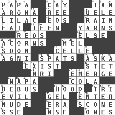 ACROSS 1. Dad 5. Island 8. Scottish cap 11. Scent 13. To separate or throw off 14. Ubangi River tributary 15. Pale purple color 16. Greek goddess of the dawn 17. Precipitation 18. Ingest 19. Adolescent 21. Tall tales 22. Vintage cars 24. Otherwise 25. Oak nuts 27. Cartoonist voice _ Blanc 29. Within a short period 30. Cell (Danish) 32. Hindu god of fire 33. Arguments over trivial matters 35. "____ silly question..." 39. Have an existence 41. Proofreading order 42. Medical imaging device (abbr.) 43. Develop 45. California wine valley 48. Root beer relative 49. To get out of a bus 50. Parka part 52. Three (prefix) 55. Tending to cause great harm 56. Set 57. Keyboard key 59. Naked 60. Period 61. Biscuitlike quick bread 62. Compass dir. 63. Overdraft (abbr.) 64. Washington bills DOWN 1. Light colored 2. Operatic vocal solo 3. Characterized by complete cowardliness 4. Housemaid (var.) 5. Algonquian 6. Age 7. It is so 8. Pulls apart 9. Place in a line 10. Not women's 12. Gambison 14. Mountain range 20. Curvy letter 21. Shout 23. Bert's buddy 25. White ___ sheet 26. Gear tooth 27. Was introduced to 28. Raised railways 30. Domesticated feline 31. Artist's stand 33. Title for a knight 34. Air pressure measure (abbr.) 36. Ski resort town in Vermont 37. Cask 38. Had dinner 40. Dec. holiday 43. Environmental prefix 44. Methods 45. Congenital growth or mark on the skin 46. Remain 47. Whine 49. Lairs 50. Possessive pronoun 51. Norwegian king 53. French philosopher Descartes 54. Angers 56. Commissioned mil. rank 58. Non-commissioned officer (abbr.)