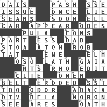 ACROSS 1. Raised platform 5. Romantic infatuation 9. Compass dir. 12. Come out of 14. At one time in the past 15. Untruth 16. Actors Connery and Penn 17. Within a short period 18. Pipe bend 19. Auto 20. Seem 23. Lyric poems 24. Monetary unit of Botswana 25. Immeasurably long periods of time 27. Component 30. Double-curved letter 32. June honoree 33. Portico 34. Smallest unit of an element 36. Director Reiner 38. Make lace 39. Compass dir. 40. Shade tree 43. Bear (Spanish) 46. Thin strip of wood or metal 48. Greek goddess of the earth (variant) 49. Mountains (abbr.) 51. 17th letter of the Greek alphabet 52. Prepare for publication 53. Quote 54. Sign of things to come 56. Waist strap 58. Eaten away 61. Fast jet (abbr.) 64. Wedding promise 65. Aroma 66. Phillipine bananalike plant 68. HTML Container Element 69. Actor Lugosi 70. Person of subnormal intelligence 71. Observe 72. Ancient Greek god of war 73. Pledge DOWN 1. Plate 2. Toward the sea 3. Austrian river, tributary to the Danube 4. Player for Phoenix 5. Introduce or present, as a question 6. Small Philippine buffalo 7. Tallied 8. Layer 9. Bobsleighs 10. Filth; sediment 11. Snakelike fish 13. Son of Isaac 21. Entreaty 22. Soft color 23. Southwest Nigerian state 24. Parent Teacher Assoc. 26. Boat paddle 27. Pacific Standard Time (abbr.) 28. "One Day ___ Time" 29. Printing process, for short 31. Underwater navigation system 35. Mode 37. Necklace unit 41. Cards in a Roman deck? 42. Floor protector 44. Stricken, poetically 45. Baseball player Mel 47. Dwelling 48. Commissioned mil. rank 50. Sowing specialist 53. Garlic unit 55. Dutch treat 56. Auction offers 57. Singer Brickell 59. Hero or heavy, e.g. 60. Mouths or openings 61. "Two Mules for Sister ____" 62. Highlander 63. Hyperbolic tangent 65. Chief or king in Benin or Nigeria 67. Oct. 31 cry