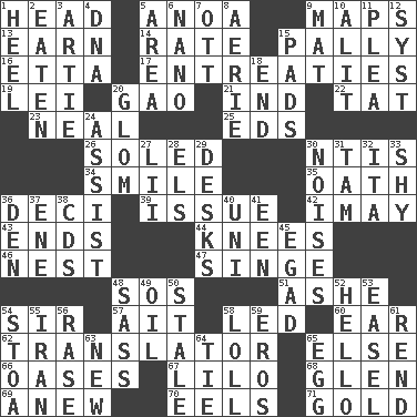 ACROSS 1. Froth on beer 5. Small Philippine buffalo 9. Atlas contents 13. Merit 14. Pace 15. Chummy 16. Singer James 17. Pleas 19. Luau accessory 20. E Mali city 21. Indiana (abbr.) 22. Make lace 23. Actress Patricia 25. Begley and Asner 26. Having a sole or soles 30. Nuclear Threat Initiatives 34. Grin 35. Pledge 36. Tenth: prefix 39. Come out of 42. "If ____ say so..." 43. Conclusions 44. Leg joints 46. Egg locale 47. Scorch 48. Mayday 51. American tennis player Robert 54. Title for a knight 57. Small island 58. Directed 60. Hearing organ 62. Interpreter 65. Otherwise 66. Fertile tracts in a desert 67. _ and Stitch 68. Small, secluded valley 69. Afresh 70. Snakelike fish 71. Gilded DOWN 1. Person who is morally reprehensible 2. Ingested 3. Nick name for Arthur 4. Heredity factor (abbr.) 5. Length times width 6. Billionth: prefix 7. Baseball player Mel 8. Nest on high 9. Floor covering 10. Set down 11. Entreaty 12. System (abbr.) 15. Writing tablets 18. Conclusion 20. Seize upon or latch onto something 24. Help 27. Cards in a Roman deck? 28. Raised railways 29. Writing tables 30. Annoying sounds 31. Scottish cap 32. Call ___ day 33. Like a shrinking violet 36. Lair 37. Compass dir. 38. Music discs 40. Corn or form start 41. Car or cant ending 45. Mild oath 48. Backtalk 49. Petroleum 50. Having lost freshness 52. Phone greeting 53. Artist's stand 54. Portico 55. SW Asia republic 56. Raze (variant) 58. Hang loosely or laxly 59. Greek god of love 61. Tear apart 63. ___ Haven, CT 64. Neckwear 65. Ovum