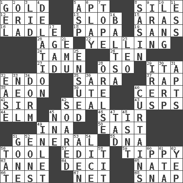 ACROSS 1. Precious metal 5. Fitting 8. Filth; sediment 12. 4th largest of the Great Lakes 13. Messy guy 15. Caspian sea tributary 16. Dipping utensil 18. Dad 19. Without 20. Ripen 22. Crying or shouting loudly 24. Not wild 26. "___ Little Indians" 27. Goddess of spring and wife of Bragi 28. Bear (Spanish) 29. Call ___ day 32. Inside; within (prefix) 35. "Two Mules for Sister ____" 37. Strike 38. A really long time 39. Shoshoni 40. Sure thing 41. Title for a knight 42. Lick closed 43. United States Postal Service (abbr.) 44. Shade tree 45. Lower and raise head in agreement 46. Use a swizzle stick 49. _ tizzy (2 wds.) 50. Compass direction 51. Commissioned military rank 55. Heredity factor (abbr.) 56. Instrument 57. Prepare for publication 59. Likely to tip or tilt 63. Singer Murray 64. Tenth: prefix 65. Nathan's nickname 66. Trial 67. Fish or hair follower 68. Fastener DOWN 1. Set 2. Mouth or opening 3. Flaplike covering 4. Conveyance 5. Cleo's killer 6. Romp 7. Drink excessively 8. Indian antelope 9. SW Asia republic 10. Austrian-born American filmmaker Fritz 11. Double-curved letter 14. Greek mezzo-soprano Agnes 17. Mild oath 21. Australian flightless bird 23. Lion 25. Followed as a consequence or result 28. Threatening words 29. Angers 30. Canvas cover 31. Flats, for short 32. Relaxation 33. Famous astronaut Armstrong 34. Dormintory (informal) 36. "One Day ___ Time" 40. Window treatments 42. Flew 45. Compass dir. 47. Bit 48. Is not 49. An arm off of a larger body of water 51. Went 52. Immeasurably long periods of time 53. Arabian gulf 54. Louse (plural) 56. Make lace 58. Teat (slang) 60. Baking dish 61. Parent Teacher Assoc. 62. Slangy assent