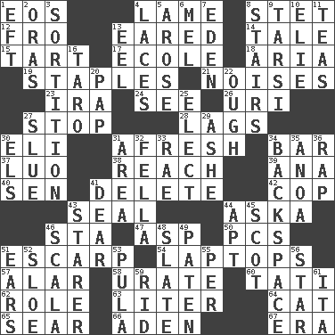 ACROSS 1. Greek goddess of the dawn 4. Unable to walk 8. Proofreading order 12. Back 13. Having ears or earlike features 14. Lie 15. Small pie 17. Learning spot: Fr. 18. Roberta Peters solo 19. Paper fasteners 21. Annoying sounds 23. Lyricist Gershwin 24. Perceive with the eye 26. RI univ. 27. Close up, plug up 28. Straggles 30. Connecticut Ivy Leaguer 31. Anew 34. Oblong piece of solid material 37. Nilotic language 38. Arrive at 39. Santa ___, CA 40. Elected rep. 41. Erase 42. Police officer (slang) 43. Lick closed 44. "____ silly question..." 46. R.R. building 47. Cleo's killer 50. Personal Computers (abbr.) 51. Fortification 54. Portable computers 57. Having or resembling wings 58. A salt of uric acid 60. Jacques of French films 62. Hero or heavy, e.g. 63. 61 cubic inches 64. Feline 65. Burn superficially 66. Arabian gulf 67. Period DOWN 1. Newt 2. Mouths or openings 3. Decision 4. Shoestrings 5. Came up 6. Cartoonist voice _ Blanc 7. Locale of original sin 8. Flight of steps 9. Tarsus (plural) 10. Writer Wiesel 11. Beverages made from leaves 13. Snakelike fish 16. Edible starchy tuberous root 20. Infant food 22. Ending for "Through" and "Enough" 25. Voters do this 27. Change direction abruptly 29. American tennis player Robert 30. Raised railways 31. Length times width 32. Chap (slang) 33. Actress Charlotte 34. Keyboard key 35. Small Philippine buffalo 36. Reproach for some lapse or misdeed 41. Letter starter 43. A viewer who gazes fixedly 44. Fitting 45. Native of Scotland 46. Any of the three canals of the cochlea 48. Schedule 49. Eucharist need 51. Hearing organs 52. _ gin 53. Monetary unit of Botswana 55. For each 56. Play the lead 59. To free from 61. Call ___ day