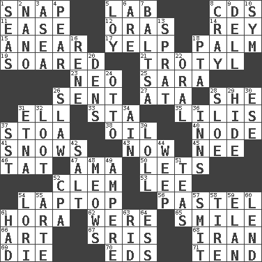 ACROSS 1. Fastener 5. Experiment locale 8. Music discs 11. Comfort 12. Mouths or openings 14. Marina Del _, California 15. Approach 17. Sharp bark 18. Inside of hand 19. Flew 21. TNT 23. Modern: prefix 25. "Two Mules for Sister ____" 26. Posted 27. "One Day ___ Time" 28. A female animal or person 31. Pipe bend 33. R.R. building 35. Ms. Damita and namesakes 37. Portico 38. Lubricate 40. Thickened enlargement 41. Frozen precipitation (plural) 43. At this time 45. Born 46. Make lace 47. Housemaid (var.) 50. Allows 52. Clement's nick name 53. Area sheltered from the wind 54. Portable computer 56. Soft color 61. Israeli folk dance 62. Past tense of be (plural) 65. Grin 66. Nonscientific branch of learning 67. Indian titles of respect 68. SW Asia republic 69. Pass on 70. Begley and Asner 71. Be inclined (to) DOWN 1. Oceans 2. Billionth: prefix 3. At sea 4. Lightbulb-shaped fruit 5. Myrna of the movies 6. "We ___ not amused" (Victoria) 7. Greek mezzo-soprano Agnes 8. Supercomputer manufacturer 9. Small valley 10. Symbol (abbr.) 13. Small fatty European fish 16. French philosopher Descartes 18. Parent Teacher Assoc. 20. Hiding places for outlaws 22. Relating to the mouth 24. "Beetle Bailey" pooch 26. Cole _ (cabbage dish) 28. _ gin 29. Flintstone garb 30. Compass dir. 31. Inactive volcano in Sicily 32. Spoils 34. The 18th letter of the Arabic alphabet 36. Lodging establishments 37. Fast jet (abbr.) 39. Hang loosely or laxly 42. Table seasoning 44. Shed a tear 48. Catcalls? 49. Electrical Unit 51. Afternoon social gatherings 52. Accounting whiz (abbr.) 54. Australian parrot (variant) 55. Johnson of "Laugh-In" 57. Stricken, poetically 58. Hoop that covers a wheel 59. Style 60. Grant temporary use of 61. Possessed 63. To free from 64. Curvy letter