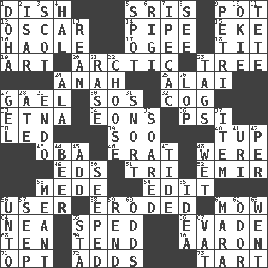 ACROSS 1. Food container 5. Indian titles of respect 9. Cooking vessel 12. Motion picture award 14. Corncob 15. Make supply last 16. White Person, in Hawaii 17. Double curve, resembling the letter S 18. Teat (slang) 19. Nonscientific branch of learning 20. Northern region 23. Family _ (genealogy) 24. Housemaid 25. Jai _ 27. Highlander 30. Distress signal 32. Gear tooth 33. Inactive volcano in Sicily 34. Immeasurably long periods of time 36. Air pressure measure (abbr.) 38. Directed 39. "Barney Miller" actor Jack 40. Uncastrated adult male sheep 43. Chief or king in Benin or Nigeria 46. Part of Q.E.F. 48. We are 49. Begley and Asner 51. Three (prefix) 52. Independent ruler or chieftain 53. Ancient Persian 54. Prepare for publication 56. One who makes use of a thing 58. Worn away 61. Cut the grass 64. Teachers' org. 65. Hurried 66. Dodge 68. "___ Little Indians" 69. Look after 70. Composer Copland 71. Elect 72. Sums up 73. Small pie DOWN 1. Capital of the state of Qatar 2. Austrian river, tributary to the Danube 3. Highlander 4. Actor Linden 5. Specific locale 6. Swiss mountan, "Queen of the Mountains" 7. Medicinal drug used to evoke vomiting 8. Perceive with the eye 9. _ dish (used to culture cells) 10. Migrant worker of the '30s 11. False hair 13. 480, 500 or 516 sheets of paper 21. Raze (variant) 22. Elect 23. Labels 24. In the manner of 26. Trim (branches) 27. Set 28. Had dinner 29. Inside; within (prefix) 31. Derisive sound 35. Flew 37. A whole individual unit 41. RI univ. 42. For each 44. Fermented drink made from hops 45. Increase 47. Periodic rise and fall of the sea level 48. Dripping 50. Oozed 53. Intended 55. The content of cognition 56. To (old English) 57. Ooze 59. Tear apart 60. Probability 61. Hindu Mythology: god of death 62. Aroma 63. Left 65. R.R. building 67. Large container