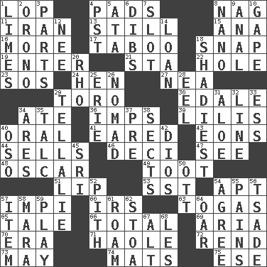 ACROSS 1. Trim (branches) 4. Writing tablets 8. Tired old horse 11. SW Asia republic 13. Free of sound 15. Santa ___, CA 16. Greater amount 17. Off limits 18. Fastener 19. Keyboard key 21. R.R. building 22. Opening into or through something 23. Mayday 24. Layer 27. Teachers' org. 29. "Corrida" creature 30. Peak District village in England 34. Had dinner 36. Naughty children 39. Ms. Damita and namesakes 40. Spoken 41. Having ears or earlike features 43. Immeasurably long periods of time 44. Exchanges for money 46. Tenth: prefix 47. Observe 48. Witty Wilde 49. A blast of a horn 51. Mouth edge 53. Fast jet (abbr.) 54. Fitting 57. Body of Kaffir warriors 60. Big collection agency 63. Ancient Roman robes 65. Story 66. "_____ Recall" 69. Roberta Peters solo 70. Period 71. White Person, in Hawaii 72. Tear apart 73. Can I? 74. Floor protectors 75. Compass dir. DOWN 1. Citrus fruits 2. U. of Maine site 3. Actors' quests 4. Pacific Standard Time (abbr.) 5. _ moment's notice (2 wds.) 6. Rights 7. Slit 8. Billionth: prefix 9. Of or related to the anus 10. Open wide 12. Born 14. Grant temporary use of 18. Most dark, concealed or hidden 20. 17th letter of the Greek alphabet 25. One of the Great Lakes 26. Wanderer 28. Snakelike fish 29. Copy Pinocchio 31. _ vera 32. Actor's bit 33. Double-curved letter 34. Ancient Greek god of war 35. Baby powder 37. Before (prefix) 38. Religious groups 40. Bear (Spanish) 42. "Vaya con ____" 45. Indian title of respect (Mr.) 50. Baseball player Mel 52. Heart or essence 54. Match 55. Aches 56. Sadhe (variant) 57. A whole individual unit 58. Hindu Mythology: god of death 59. Shaw product 61. Wander 62. Portico 64. Boat paddle 67. The first octave above the treble staff 68. French article