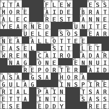 ACROSS 1. Call ___ day 4. Soared 8. Double-curved letter 11. Greater amount 13. Helper 14. Naughty child 15. Actor Baldwin 16. Relief 17. Singer Murray 18. Had a strong desire 21. Join together 22. Ubangi River tributary 23. Mayday 25. Hearing organ 26. Teachers' org. 29. One to whom something is allotted 32. Artist's stand 34. Be seated 35. Allow 38. Songbird 39. Capital of Egypt 41. The sixth month of the Jewish calendar 43. Tired old horse 44. Single 45. World-weariness 46. Newsperson 50. Assist 51. White ___ sheet 54. Girls' org. (abbr.) 55. Israeli folk dance 57. Russian prison camp 59. Motivate 63. Monetary unit of Yemen 64. Ache 67. Russian ruler of old 68. Singer James 69. International (abbr.) 70. Backtalk 71. Compass dir. 72. Whirlpool 73. To sift DOWN 1. "If ____ say so..." 2. Lacquered or enameled metalware 3. Length times width 4. Burden 5. Whopper 6. Begley and Asner 7. Soggy 8. Bert's buddy 9. Before Barbara or Clara 10. Navigate 12. Shade of tan 14. Forbid 19. Actress Patricia 20. Pipe bend 21. Purpose 23. Use a swizzle stick 24. Von Bismarck 26. ___ Haven, CT 27. Merit 28. Toward the sea 30. Flexible twig of a willow tree 31. Enthusiasm 33. Engineer (abbr.) 36. Pulitzer Prize-winning author Ferber 37. "Change" in Tahitian 39. 911 reaches them 40. Small Philippine buffalo 42. To free from 45. Blunders 47. Oval reproductive body of a fowl 48. Without thickness 49. Age 51. Match 52. Costumes for special activities 53. Having winglike extensions 56. Tenement units (abbr.) 58. Chicken ___ king 60. Austrian river, tributary to the Danube 61. Raze (variant) 62. Celtic language 64. Sliced dessert 65. Plus 66. It would