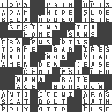 ACROSS 1. Chops off 5. Ache 9. Elects 13. First man 14. Flintstone garb 15. A type of plum 16. Actor Lugosi 17. Cowboy competition 18. False hair 19. French poetic form 21. Afternoon social gathering 22. Residence 23. Without 24. Epoch 27. Purulenc 28. Rights 29. Singer Mel 31. Oblong piece of solid material 32. Angers 36. Nathan's nickname 37. Disorderly crowd 38. Small bottle 39. So be it 40. Morning condensation 41. Stop 42. Incision 44. Air pressure measure (abbr.) 46. Directed 47. Nanny 48. Pace 50. Adept person 51. Mood resulting from idleness 54. Against 56. Ancient Celtic tribe of eastern Britain 58. Caspian sea tributary 60. Jazz singing style 61. Stupid person 62. Thin strip of wood or metal 63. More than one (prefix) 64. Von Bismarck 65. Otherwise DOWN 1. Experiment locale 2. Lyric poems 3. Light colored 4. Box-office sellout 5. Gives a jingle 6. Opera by Verdi 7. Binary compound 8. Modern: prefix 9. Clearly or manifestly demonstrative 10. Entreaties 11. Small child 12. Perceive with the eye 17. Tall New Zealand timber tree 20. Drink excessively 21. Bar bill 23. Title for a knight 24. Inactive volcano in Sicily 25. Wander 26. Johnson of "Laugh-In" 28. Pat or tap gently 30. Ananias' fault 31. Ribbon knot 33. Monetary unit of Yemen 34. Comfort 35. Downhill vehicle 37. Was introduced to 40. Heredity factor (abbr.) 41. Quote 43. Compass dir. 44. Right away 45. Indian skirt 47. Brizilian seaport 49. Peak District village in England 51. Waist strap 52. Spoken 53. Floor protectors 54. Viper 55. Non-commissioned officer (abbr.) 56. Wedding promise 57. Small bed 59. A female animal or person