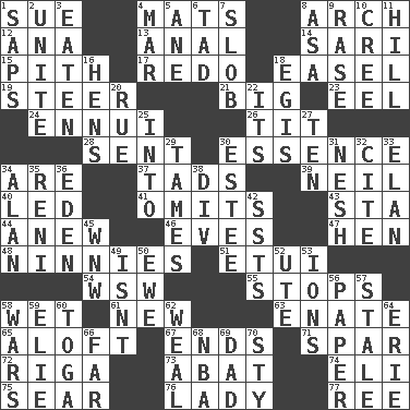 ACROSS 1. Institute legal proceedings 4. Floor protectors 8. Bowlike part 12. Santa ___, CA 13. Of or related to the anus 14. Indian skirt 15. Heart or essence 17. Do over again 18. Artist's stand 19. Navigate 21. Large 23. Snakelike fish 24. World-weariness 26. Teat (slang) 28. Emitted 30. Core 34. "We ___ not amused" (Victoria) 37. Small boys 39. Famous astronaut Armstrong 40. Directed 41. Leaves out 43. R.R. building 44. Afresh 46. Nights before holidays 47. Layer 48. Fools 51. Needle holder 54. Compass dir. 55. Halts 58. Dripping 61. ___ Haven, CT 63. Maternal 65. Upward 67. Conclusions 71. Coast Guard woman 72. Capital of Latvia 73. Blind as ____ 74. Connecticut Ivy Leaguer 75. Singe 76. Kenny Rogers chart-topper in '80 77. Portuguese money of account (variant) DOWN 1. Plant excrements 2. Join together 3. Consumed 4. Make imperfect 5. One (Scot) 6. Small boy 7. Oscar Madison type 8. White ___ sheet 9. To erase 10. Algonquian 11. Land elevation 16. Coop moms 18. Armor plate that protects the chest 20. Sorrow 22. It is 25. To the inside or interior of 27. Nine, plus one 29. Corrects by punishment or discipline 30. First name in cosmetics 31. Tender 32. Quote 33. Style 34. Actor Alda or Thicke 35. Painter Guido (1575-1642) 36. Locale of original sin 38. HTML Container Element 42. Fast planes 45. Compass dir. 49. Is not 50. She-sheep 52. Shoshoni 53. Charged atoms 56. Some stationery 57. Lacking originality or spontaneity 58. Armed conflicts 59. Writer Wiesel 60. Ancient Roman robe 62. Welt 64. One of the Great Lakes 66. At a great distance 68. Basketball assoc. 69. June honoree 70. Filthy place