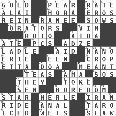 ACROSS 1. Gilt 5. Lightbulb-shaped fruit 9. Assign a rank or rating to 13. Mountain range southwest of Kyrgyzstan 14. Israeli folk dance 15. Greek god of love 16. It's straight from the horse's mouth 17. Indian princess (variant) 18. Sty mamas 19. Speakers 21. Zeal 22. Printing process, for short 23. Opera by Verdi 24. Had dinner 27. Personal Computers (abbr.) 28. Edge tool used to cut and shape wood 29. Dipping utensil 31. Help 32. Billionth: prefix 36. One of the Great Lakes 37. Shade tree 38. Riding implement 39. Singer James 40. ___ good deed 41. Intended 42. Beverages made from leaves 44. Nursemaid (var.) 46. Mayday 47. Those people 48. Puff or smoke 50. Elected rep. 51. Mood resulting from idleness 54. Play the lead 56. Haggard of country music 58. SW Asia republic 60. Travel on or in a vehicle 61. Of or related to the anus 62. Pacific island yam 63. On the rocks 64. Moistens 65. Cole _ (cabbage dish) DOWN 1. Slender fish 2. Margarine 3. Den 4. Middle Eastern gold or silver currency 5. N Egypt peninsula 6. Immeasurably long periods of time 7. "We ___ not amused" (Victoria) 8. Actress Charlotte 9. Dwelling 10. Odor 11. Pull behind 12. Curvy letter 17. College mil. group 20. Drink excessively 21. That is 23. Find the sum of 24. Toward shelter 25. Small pie 26. Prepare for publication 28. Direct toward a target or goal 30. Resembling or made to resemble leather 31. Chicken ___ king 33. Ancient river in northeast Turkey 34. Words to Nanette 35. Elects 37. Greek goddess of the dawn 40. 24 hours 41. Cause to be 43. Car or cant ending 44. Ringlike coral islands and reefs 45. Greater amount 47. Sadhe (variant) 49. Proofreads 51. Naughty child 52. Spoken 53. Hindu Mythology: god of death 54. _ Lanka 55. Nervous spasm 56. Informal term for the mouth 57. Compass dir. 59. At this time