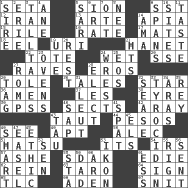 ACROSS 1. Bristle 5. The Jewish people; Israel 9. Fast jet (abbr.) 12. SW Asia republic 13. Johnson of "Laugh-In" 14. Capital of Western Samoa 15. Cause heat under the collar 16. Assign a rank or rating to 17. Floor coverings 18. Snakelike fish 19. RI univ. 21. French painter Edouard 22. Carryall 24. Soggy 26. Compass dir. 27. All-night dance parties 28. Greek god of love 29. Lacquered or enameled metalware 30. Lies 32. Play the lead 36. So be it 37. French article 38. Jane of fiction 39. Global Positioning Systems (abbr.) 40. Religious groups 42. Like ___ of sunshine 43. Drawn tight 44. Mexican monetary units 46. Observe 49. Fitting 50. Actor Baldwin 51. Taiwanese island in East China Sea 53. ___ a Wonderful Life 54. Big collection agency 57. American tennis player Robert 58. Neighbor of Neb. 61. Singer Brickell 62. It's straight from the horse's mouth 63. Edible starchy tuberous root 64. Attach a signature 65. Affectionate concern, for short 66. An important port of Yemen 67. In a ____ (agitated or irritated) DOWN 1. The founder of a family 2. One of the Great Lakes 3. Baron Munchausen's specialties 4. A saturated hydrocarbon 5. Indian skirt 6. Retirement account (abbr.) 7. Baseball player Mel 8. Born 9. Connects, as a bridge 10. Locates 11. Clothes sense 14. Nursemaid (var.) 19. Shoshoni 20. State of inaction 21. Mountains (abbr.) 23. Baking chambers 24. Obtain by seizing forcibly or violently 25. Greek goddess of the dawn 27. Frolic 28. Opt 29. Label 31. Native American of Southwest Alaska 32. Gospel singer Marvin 33. Polypeptide antibiotic 34. Caspian sea tributary 35. Marina Del _, California 40. Plant excrement 41. Petty quarrel 43. The 19th letter of the Greek alphabet 45. Raised railways 46. Don Adams' spy role 47. Artist's stand 48. Moral principle 52. Elected rep. 53. Picture 55. Swiss mountan, "Queen of the Mountains" 56. Emitted 58. R.R. building 59. Male parent 60. "We ___ not amused" (Victoria) 61. Double-curved letter