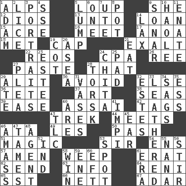 ACROSS 1. High mountains 5. Central Nebraska county 9. A female animal or person 12. "Vaya con ____" 13. To (old English) 14. Grant temporary use of 15. Measure of real estate 16. Rendezvous 17. Small Philippine buffalo 18. Was introduced to 19. Head covering 21. Glorify 22. Vintage cars 24. Numbers guy (abbr.) 26. To riddle 27. Thick mixture 28. Not this but _ 29. Came down and settled, as after flight 30. Keep away from 32. Otherwise 36. False hair 37. Tate display 38. Oceans 39. Comfort 40. Slender Brazilian palm 42. Labels 43. Long journey 44. Confronts 46. _ moment's notice (2 wds.) 49. French article 50. Romantic infatuation 51. Mysterious quality of enchantment 53. Title for a knight 54. Followers of ems 57. So be it 58. Shed a tear 61. Part of Q.E.F. 62. Transmit 63. A message received and understood 64. Painter Guido (1575-1642) 65. Fast jet (abbr.) 66. Remaining after all deductions 67. The sixth month of the Jewish calendar DOWN 1. First man 2. Louse (plural) 3. Likenesses of persons 4. Compass dir. 5. Mass 6. Single 7. Shoshoni 8. Cooking vessel 9. Underwater navigation system 10. White Person, in Hawaii 11. Related on the mother's side 14. Not strict 19. Small bed 20. At sea 21. Ingest 23. First name in cosmetics 24. Riviera of "Kiss of the Spider Woman" 25. Writing tablet 27. Entreaty 28. Cod relative 29. Had dinner 31. Flower holders 32. _____ Park, CO 33. Resembling or made to resemble leather 34. Settles 35. Double-curved letter 40. "We ___ not amused" (Victoria) 41. Body of Kaffir warriors 43. Affectionate concern, for short 45. Hearing organ 46. Collect or gather 47. Makes less strong or intense 48. Representative 52. Working for oneself (abbr.) 53. Blemish 55. Grandmother 56. Commotion 58. Victory 59. Compass dir. 60. Bank Draft (abbr.) 61. Period