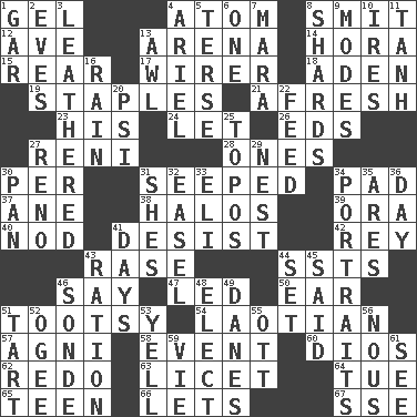 ACROSS 1. Set 4. Tiny particle 8. Stricken, poetically 12. "___ Maria" 13. Sports stadium 14. Israeli folk dance 15. Posterior 17. One who wires 18. Arabian gulf 19. Paper fasteners 21. Anew 23. Part of HMS, perhaps 24. Allow 26. Begley and Asner 27. Painter Guido (1575-1642) 28. Singles 30. For each 31. Oozed 34. Writing tablet 37. A saturated hydrocarbon 38. Auras 39. Mouth or opening 40. Dreamland 41. Cease 42. Marina Del _, California 43. To erase 44. Fast planes 46. Declare 47. Directed 50. Ewer handle 51. A girl or young woman (variant) 54. Of or relating to Laos or its people 57. Hindu god of fire 58. Incident 60. "Vaya con ____" 62. Do over again 63. It is permitted: Lat. 64. Third day of the wk. 65. Adolescent 66. Allows 67. Compass dir. DOWN 1. Slender fish 2. Nights before holidays 3. Tough but pliablecoriaceous 4. Satellite of Uranus 5. Laconic 6. Single 7. Hindu Mythology: god of death 8. Broken pieces 9. Methods 10. Angers 11. Hyperbolic tangent 13. Leather borer 16. Precipitation 20. 23rd letter of the Greek alphabet 22. Nourish 25. Literary convention 27. Western Nevada city 29. Egg locale 30. Baking dish 31. "______ My Girl" (Turtles hit) 32. Artist's stand 33. Connecticut Ivy Leaguer 34. Likenesses of persons 35. Ancient Greek god of war 36. 24 hours 41. 24-hour periods 43. Food allowance for one day 44. Arrange properly for use 45. Stated 46. Message 48. Opt 49. Natives or inhabitants of Denmark 51. Small pie 52. Double curve, resembling the letter S 53. Shout 55. Baseball player Mel 56. Common sense 59. Compete 61. Perceive with the eye