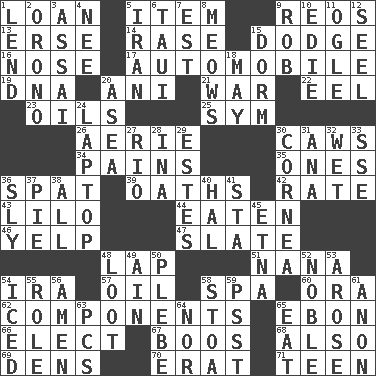 ACROSS 1. Grant temporary use of 5. A distinct part 9. Vintage cars 13. Celtic language 14. Raze (variant) 15. Evade 16. Sense of smell 17. Form of transportation 19. Heredity factor (abbr.) 20. Cuckoo 21. Armed conflict 22. Snakelike fish 23. Petroleums 25. Symbol (abbr.) 26. Nest on high 30. Crow sounds 34. Aches 35. Washington bills 36. Argument over a trivial matter 39. Curses 42. Pace 43. _ and Stitch 44. Ingested 46. Sharp bark 47. Chalkboard 48. Infant locale 51. Grandmother 54. Lyricist Gershwin 57. Lubricate 58. Health resort 60. Mouth or opening 62. Pieces 65. Inky black, to poets 66. Opt 67. Scornful sounds 68. In addition 69. Cub Scout units 70. Part of Q.E.F. 71. Adolescent DOWN 1. Grant temporary use of 2. U. of Maine site 3. Slender Brazilian palm 4. Born 5. SW Asia republic 6. "Change" in Tahitian 7. Eastern Standard Time (abbr.) 8. Catcalls? 9. Director Reiner 10. Singer Brickell 11. Stare 12. Sew up the eyelids of hawks and falcons 15. Dormintory (informal) 18. Can I? 20. At sea 24. Portable computer 27. _ de Janeiro 28. _ tizzy (2 wds.) 29. _____ Park, CO 30. Pupil covering 31. Santa ___, CA 32. Soggy 33. Compass dir. 36. Insidious 37. Sliced dessert 38. 100% 40. Actor Linden 41. R.R. building 45. Inactive volcano in Sicily 48. Plunder 49. The 18th letter of the Arabic alphabet 50. Cadet 52. Having high moral qualities 53. Came up 54. On the rocks 55. Hero or heavy, e.g. 56. So be it 58. Portico 59. Inconspicuous attention getter 61. At once, immediately (arch.) 63. Personal Computers (abbr.) 64. Not either 65. Ingest
