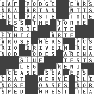 ACROSS 1. Clumsy lout 4. Puddle 9. Hearing organs 13. Basketball assoc. 14. Believer in; advocate of (suffix) 15. Nuclear Threat Initiatives 16. Pipe bend 17. Thick mixture 18. Lacquered or enameled metalware 19. Curvy letter 21. Definite Article 22. Singer Mel 24. One of the Great Lakes 26. Had dinner 27. Principle of right and wrong 29. Johnson of "Laugh-In" 30. Came up 31. Possessive pronoun 33. Personal Computers (abbr.) 36. _ de Janeiro 37. Popular '50s hangout 40. Portuguese money of account (variant) 41. Allow head to fall sleepily 42. Lyric poems 43. Sports stadium 45. Change direction abruptly 47. Trials 48. Part of a journey 49. Painter Guido (1575-1642) 50. Desist 52. Ocean 54. Begley and Asner 56. Part of Q.E.F. 57. Impudent aggressiveness 59. Biblical high priest 61. Characteristic smell of wine 62. Fertile tracts in a desert 63. And not 64. Drove too fast 65. Take or capture by force 66. Afternoon social gathering DOWN 1. Single 2. Competent 3. It jiggles the polygraph 4. Infant food 5. Declaim 6. Food container 7. Yard entry 8. Compass dir. 9. Main course 10. Tiny particle 11. Cause heat under the collar 12. Compass dir. 20. Indian titles of respect 22. Tarsus (plural) 23. Baseball player Mel 25. On the rocks 27. Merit 28. Musical group of three 29. Ancient Greek god of war 31. Flintstone garb 32. First lady 33. Elected leader of a country 34. Penny 35. Oceans 38. Makeup applied to the cheeks 39. Nathan's nickname 44. French philosopher Descartes 45. Scheduled 46. French article 49. All-night dance parties 50. Riding implement 51. Comfort 52. Dry up 53. Celtic language 55. _ gin 56. Followers of ems 57. At this time 58. Eastern Standard Time (abbr.) 60. Lyricist Gershwin