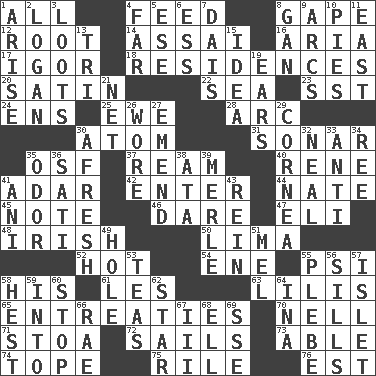 ACROSS 1. 100% 4. Nourish 8. Stare wonderingly 12. Carrot, for example 14. Slender Brazilian palm 16. Roberta Peters solo 17. Composer Stravinsky 18. Dwellings 20. Smooth fabric 22. Ocean 23. Fast jet (abbr.) 24. Followers of ems 25. She-sheep 28. Curve 30. Tiny particle 31. Echolocation 35. Order of Saint Francis (abbr.) 37. 480, 500 or 516 sheets of paper 40. French philosopher Descartes 41. The sixth month of the Jewish calendar 42. Keyboard key 44. Nathan's nickname 45. Short letter 46. Have the gumption 47. Connecticut Ivy Leaguer 48. From or relating to Ireland 50. Pale green bean 52. Being at a high temperature 54. Compass dir. 55. Air pressure measure (abbr.) 58. Part of HMS, perhaps 61. French article 63. Ms. Damita and namesakes 65. Pleas 70. 1994 drama film starring Jodie Foster 71. Portico 72. Travel by water 73. Competent 74. Drink excessively 75. Cause heat under the collar 76. Eastern Standard Time (abbr.) DOWN 1. Originate 2. Utah city north of Ogden 3. Plunders 4. Distant 5. Compass dir. 6. Double-curved letter 7. Raised platform 8. Separate the seeds from cotton 9. Curves 10. Sliced desserts 11. Compass direction 13. Three (prefix) 15. The main thing one is thinking about 19. Hearing organs 21. Fish or hair follower 26. Had on 27. Make improvements or corrections to 29. Pupil covering 30. Anew 32. Anneal 33. Opposed to 34. To sift 35. Aroma 36. Suttee (variant) 38. _ moment's notice (2 wds.) 39. Haggard of country music 41. Black tropical American cuckoo 43. It's straight from the horse's mouth 49. Hollow 51. Cartoonist voice _ Blanc 53. Afternoon social gatherings 55. First-year military academy student 56. Beverly of Met fame 57. Small island 58. Behest 59. To the inside or interior of 60. Close up, plug up 62. Play the lead 64. _ tizzy (2 wds.) 66. Actress Charlotte 67. One more than two 68. Pipe bend 69. Compass dir.